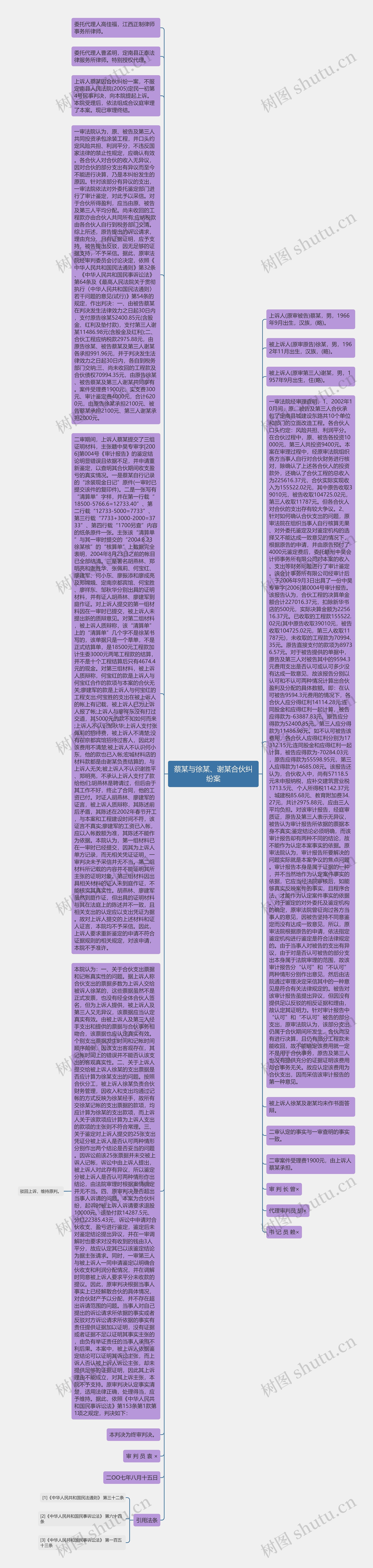 一审法院认为,原、被告及第三人共同投资承包涂装工程,并口头约定风险共担、利润平分,不违反国家法律的禁止性规定,应确认有效。各合伙人对合伙的收入无异议,因对合伙的部分支出有异议而至今不能进行决算,乃是本纠纷发生的原因。针对该部分有异议的支出,一审法院依法对外委托鉴定部门进行了审计鉴定,对此予以采信。对于合伙所得盈利,应当由原、被告及第三人平均分配。尚未收回的工程款亦由合伙人共同所有;应纳税款由各合伙人自行到税务部门交清。综上所述,原告提出的诉讼请求,理由充分、且有证据证明,应予支持,被告提出反驳,因无足够的证据支持,不予采信。据此,原审法院经审判委员会讨论决定,依照《中华人民共和国民法通则》第32条、《中华人民共和国民事诉讼法》第64条及《最高人民法院关于贯彻执行〈中华人民共和国民法通则〉若干问题的意见(试行)》第54条的规定,作出判决:一、由被告蔡某在判决发生法律效力之日起30日内,支付原告徐某52400.85元(含股金、红利及垫付款),支付第三人谢某11486.98元(含股金及红利);二、合伙工程应纳税款2975.88元,由原告徐某、被告蔡某及第三人谢某各承担991.96元,并于判决发生法律效力之日起30日内,各自到税务部门交纳;三、尚未收回的工程款及合伙债权70994.35元,由原告徐某、被告蔡某及第三人谢某共同享有。案件受理费1900元、实支费300元、审计鉴定费4000元,合计6200元,由原告徐某承担2100元、被告蔡某承担2100元、第三人谢某承担2000元。