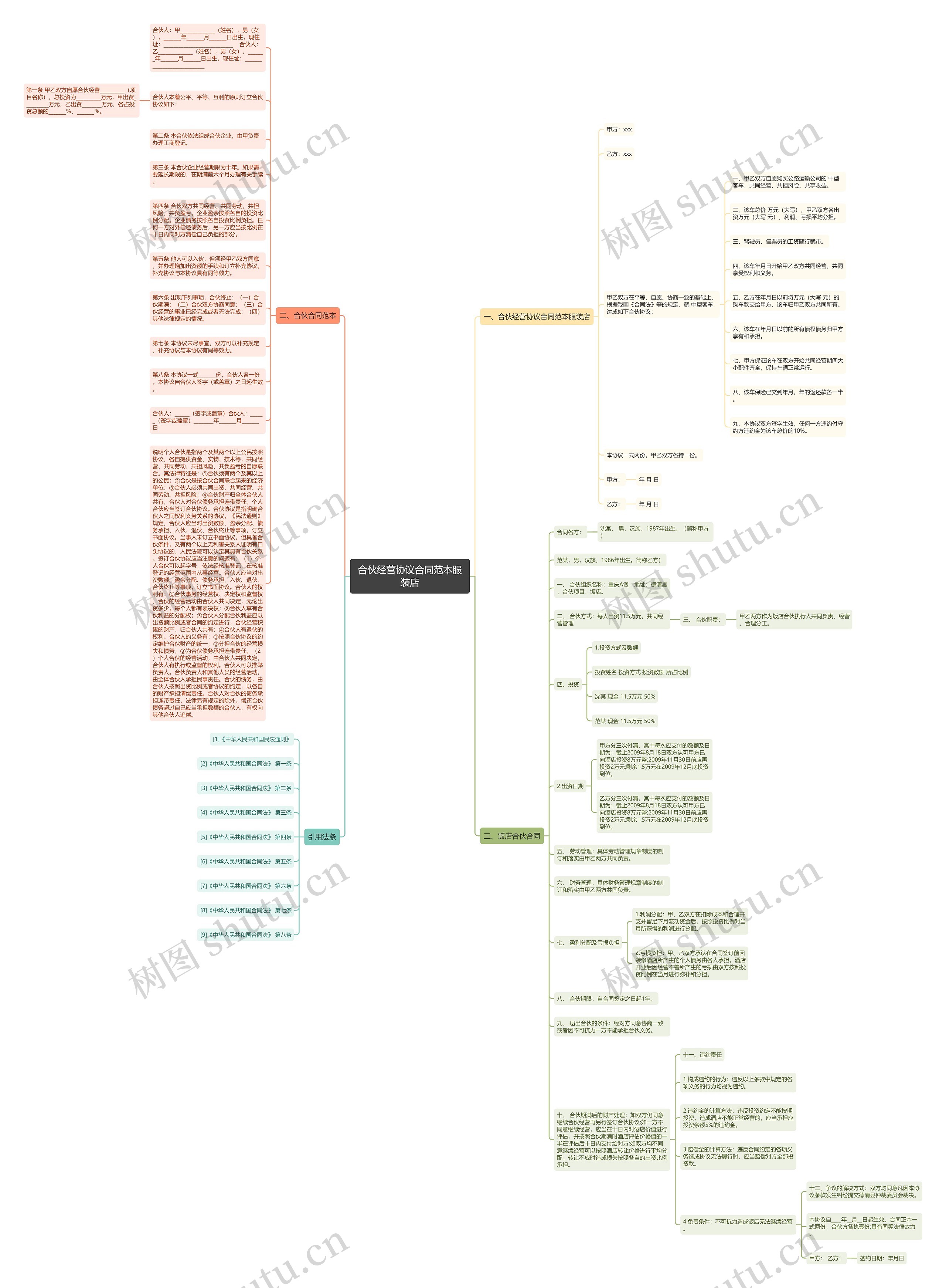 第六条 出现下列事项,合伙终止:(一)合伙期满;(二)合伙双方协商同意;(三)合伙经营的事业已经完成或者无法完成;(四)其他法律规定的情况。