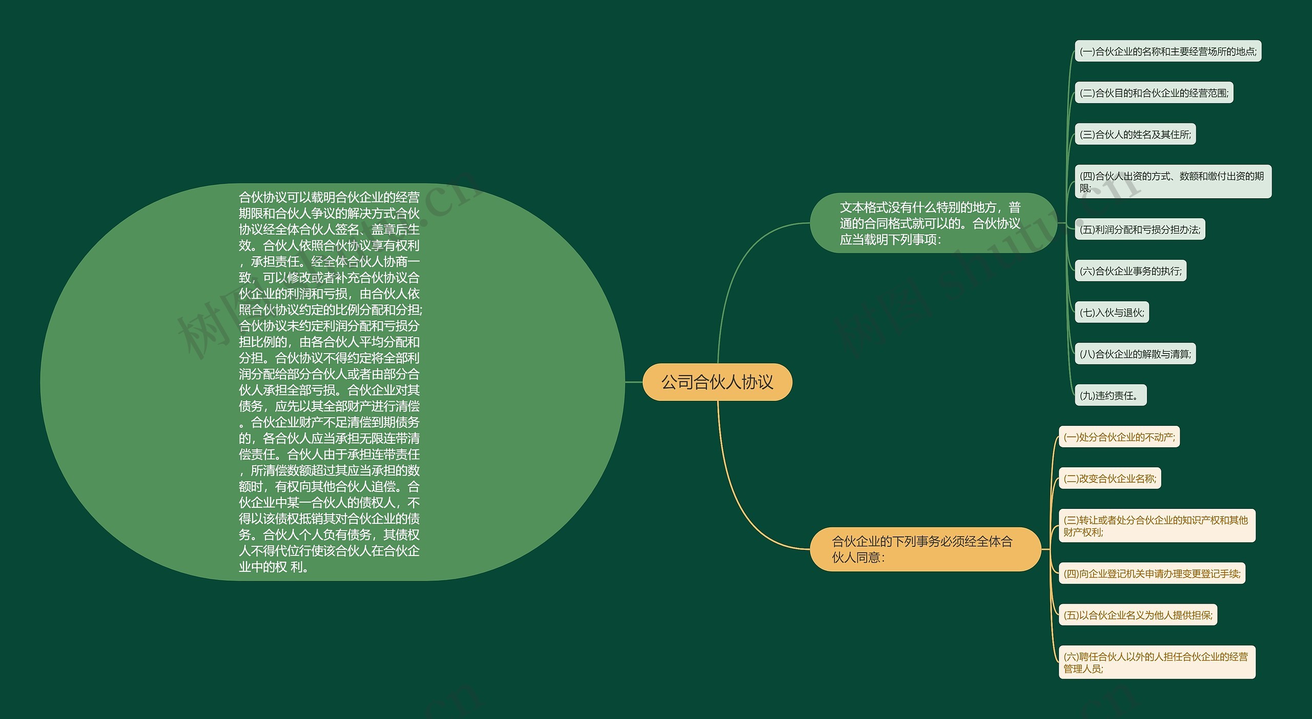 合伙协议可以载明合伙企业的经营期限和合伙人争议的解决方式合伙协议经全体合伙人签名、盖章后生效。合伙人依照合伙协议享有权利,承担责任。经全体合伙人协商一致,可以修改或者补充合伙协议合伙企业的利润和亏损,由合伙人依照合伙协议约定的比例分配和分担;合伙协议未约定利润分配和亏损分担比例的,由各合伙人平均分配和分担。合伙协议不得约定将全部利润分配给部分合伙人或者由部分合伙人承担全部亏损。合伙企业对其债务,应先以其全部财产进行清偿。合伙企业财产不足清偿到期债务的,各合伙人应当承担无限连带清偿责任。合伙人由于承担连带责任,所清偿数额超过其应当承担的数额时,有权向其他合伙人追偿。合伙企业中某一合伙人的债权人,不得以该债权抵销其对合伙企业的债务。合伙人个人负有债务,其债权人不得代位行使该合伙人在合伙企业中的权 利。
