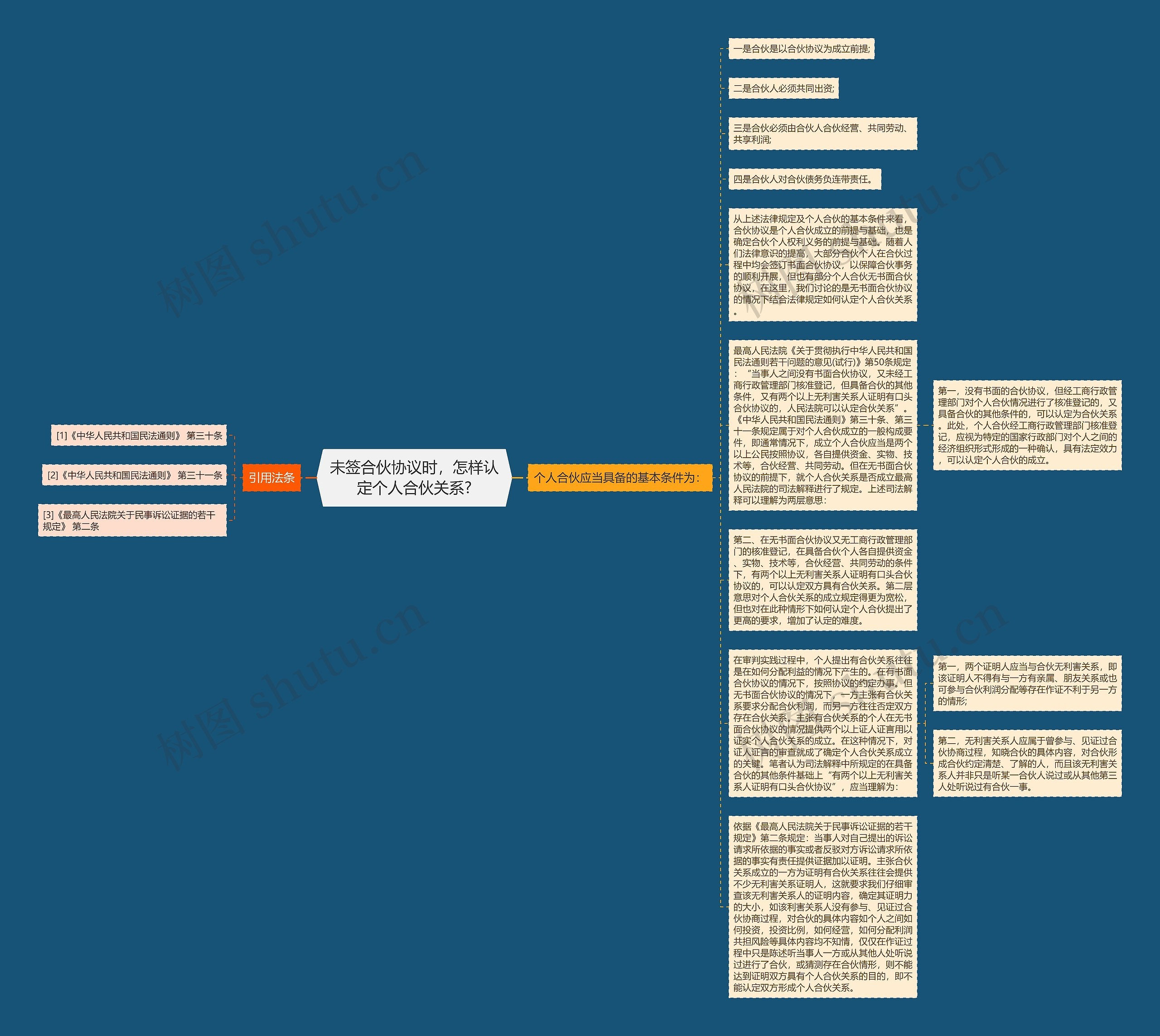最高人民法院《关于贯彻执行中华人民共和国民法通则若干问题的意见(试行)》第50条规定:“当事人之间没有书面合伙协议,又未经工商行政管理部门核准登记,但具备合伙的其他条件,又有两个以上无利害关系人证明有口头合伙协议的,人民法院可以认定合伙关系”。《中华人民共和国民法通则》第三十条、第三十一条规定属于对个人合伙成立的一般构成要件,即通常情况下,成立个人合伙应当是两个以上公民按照协议,各自提供资金、实物、技术等,合伙经营、共同劳动。但在无书面合伙协议的前提下,就个人合伙关系是否成立最高人民法院的司法解释进行了规定。上述司法解释可以理解为两层意思: