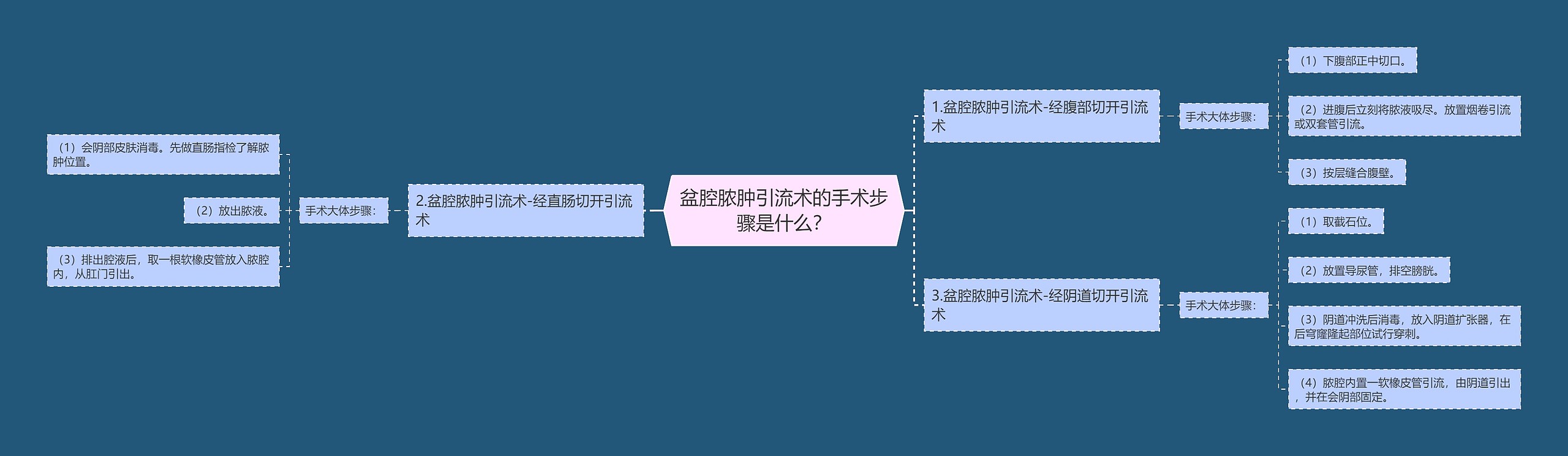 树图思维导图提供《盆腔脓肿引流术的手术步骤是什么?》在线思维导图免费制作,点击“编辑”按钮,可对《盆腔脓肿引流术的手术步骤是什么?》进行在线思维导图编辑,本思维导图属于思维导图模板主题,文件编号是:bc91b8d152ab5b2d87b8512da6e262b5