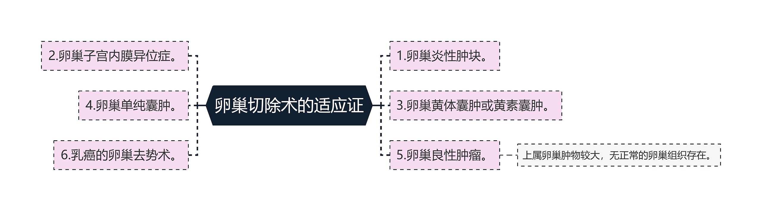 树图思维导图小编整理了卵巢切除术的适应证如下,请各位妇产科主治医师考生仔细查看。1.卵巢炎性肿块。2.卵巢子宫内膜异位症。3.卵巢黄体囊肿或黄素囊肿。4.卵巢单纯囊肿。5.卵巢良性肿瘤。上属卵巢肿物较大,无正常的卵巢组织存在。6.乳癌的卵巢去势术。