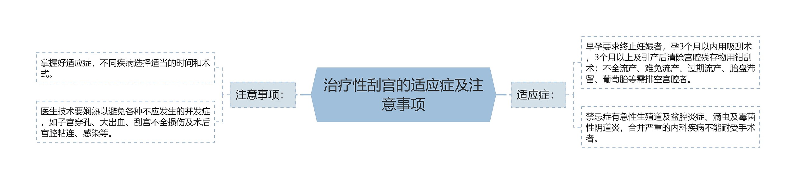 树图思维导图小编整理了治疗性刮宫的适应症及注意事项如下,请各位考生仔细查看。 适应症: 早孕要求终止妊娠者,孕3个月以内用吸刮术,3个月以上及引产后清除宫腔残存物用钳刮术;不全流产、难免流产、过期流产、胎盘滞留、葡萄胎等需排空宫腔者。