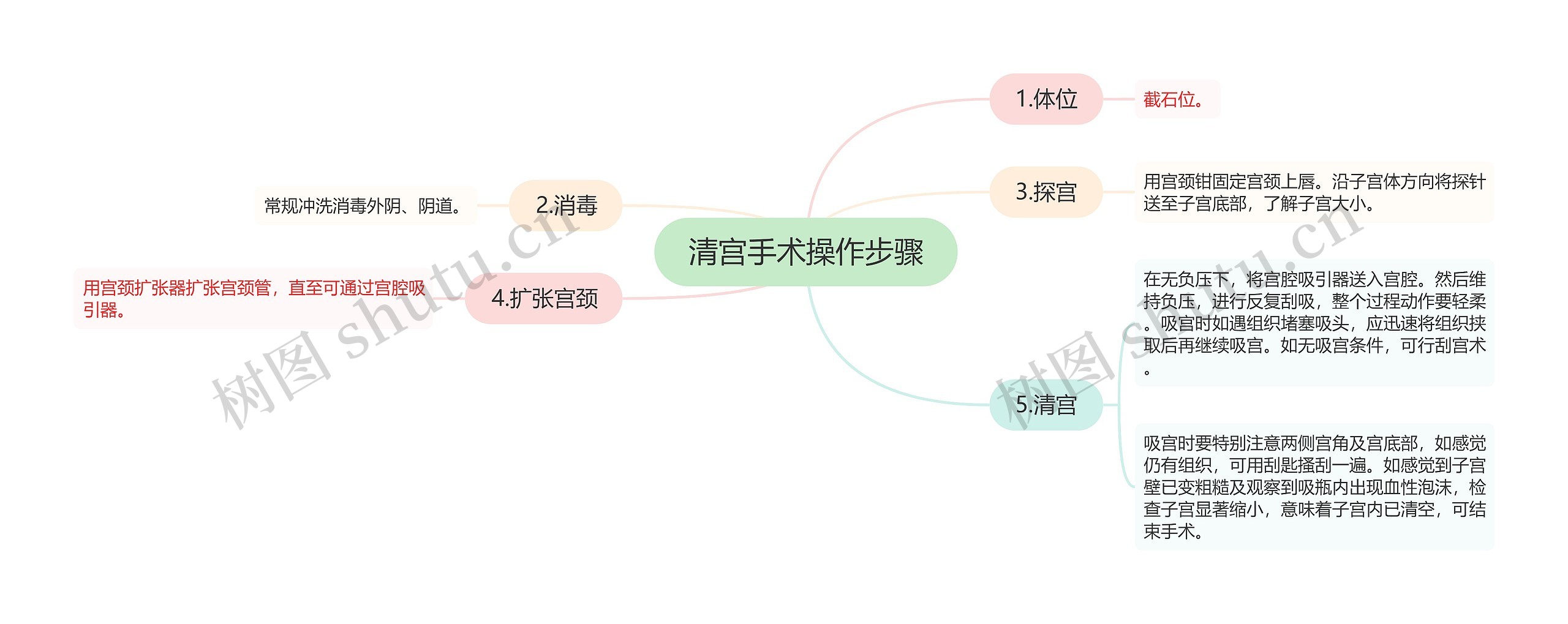 树图思维导图小编整理了清宫手术具体操作步骤如下,请各位考生仔细查看。 1.体位 截石位。 2.消毒 常规冲洗消毒外阴、阴道。 3.探宫 用宫颈钳固定宫颈上唇。沿子宫体方向将探针送至子宫底部,了解子宫大小。 4.扩张宫颈 用宫颈扩张器扩张宫颈管,直至可通过宫腔吸引器。 5.清宫 在无负压下,将宫腔吸引器送入宫腔。