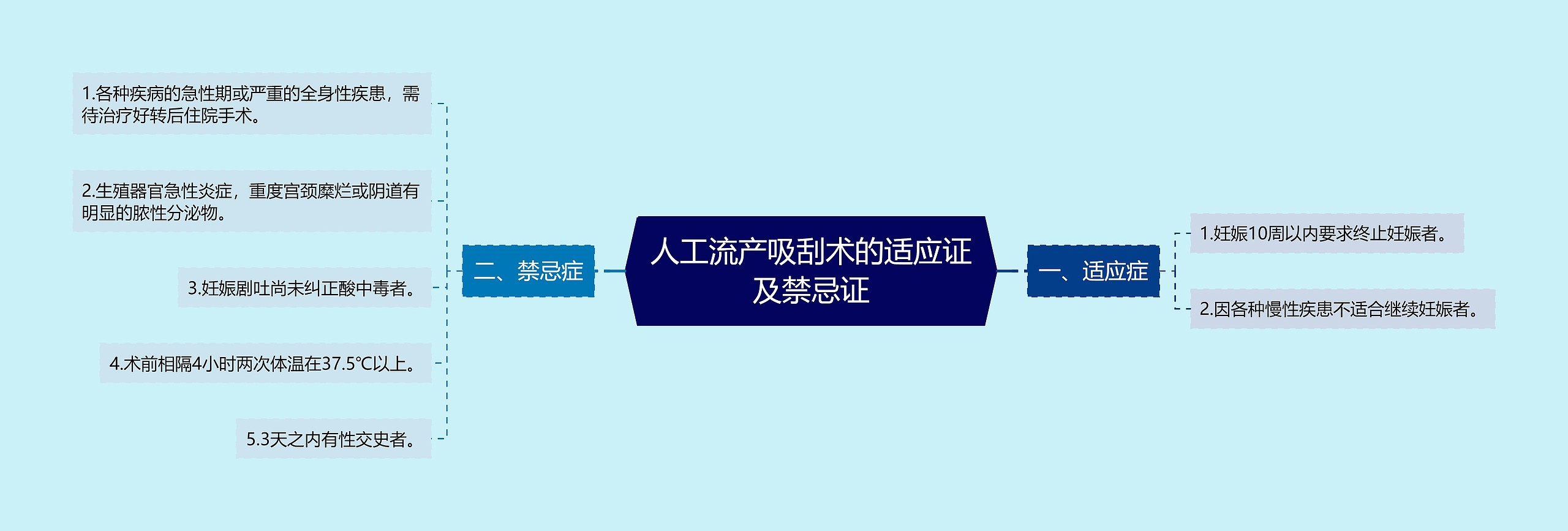 树图思维导图小编整理了人工流产吸刮术的适应证及禁忌证如下,请各位考生仔细查看。 一、适应症 1.妊娠10周以内要求终止妊娠者。 2.因各种慢性疾患不适合继续妊娠者。 二、禁忌症 1.各种疾病的急性期或严重的全身性疾患,需待治疗好转后住院手术。 2.生殖器官急性炎症,重度宫颈糜烂或阴道有明显的脓性分泌物。