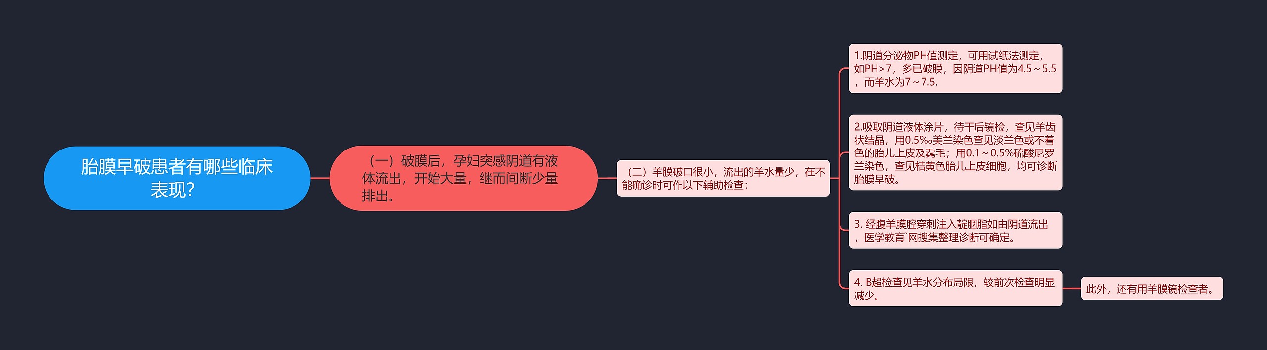 胎膜早破患者有哪些临床表现?树图思维导图小编整理如下,请各位考生仔细查看。 (一)破膜后,孕妇突感阴道有液体流出,开始大量,继而间断少量排出。