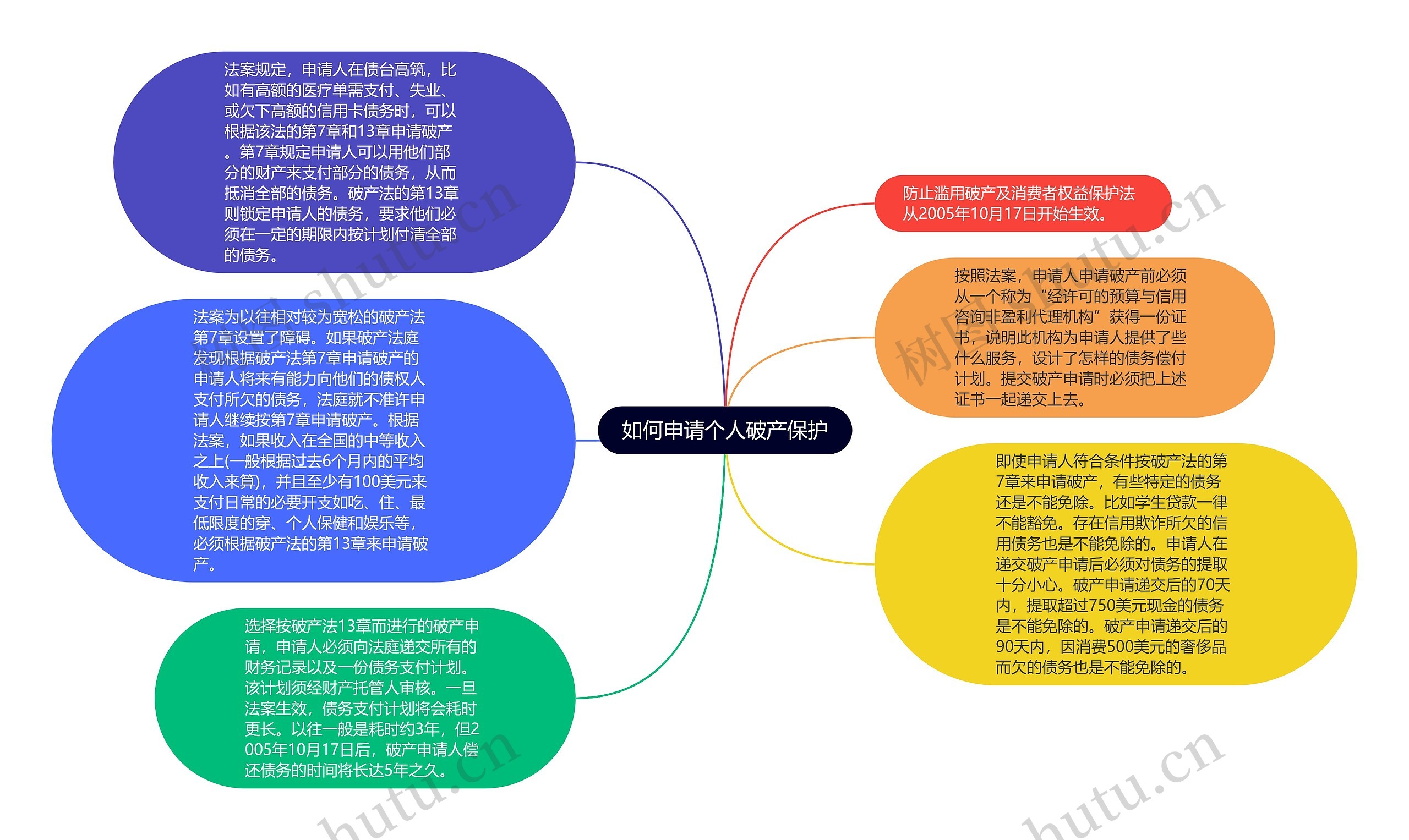 法案规定,申请人在债台高筑,比如有高额的医疗单需支付、失业、或欠下高额的信用卡债务时,可以根据该法的第7章和13章申请破产。第7章规定申请人可以用他们部分的财产来支付部分的债务,从而抵消全部的债务。破产法的第13章则锁定申请人的债务,要求他们必须在一定的期限内按计划付清全部的债务。