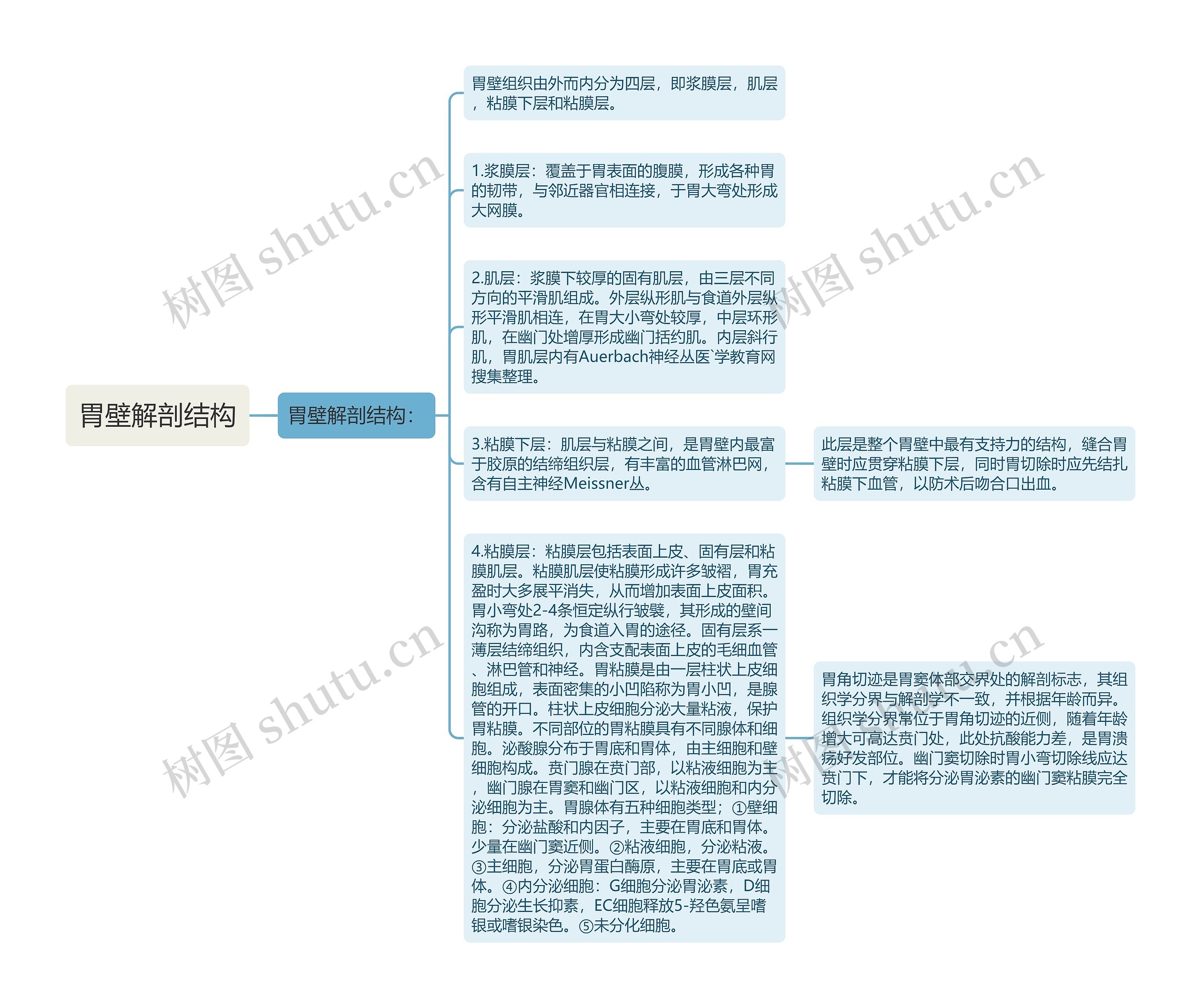 1.浆膜层:覆盖于胃表面的腹膜,形成各种胃的韧带,与邻近器官相连接,于胃大弯处形成大网膜。