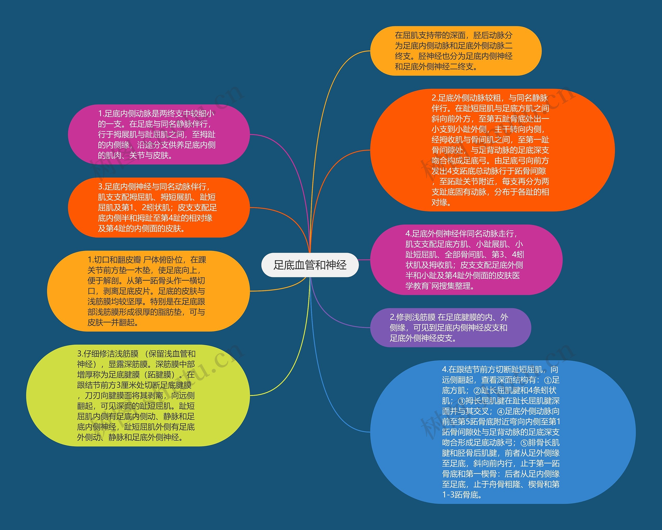 在屈肌支持带的深面,胫后动脉分为足底内侧动脉和足底外侧动脉二终支。胫神经也分为足底内侧神经和足底外侧神经二终支。