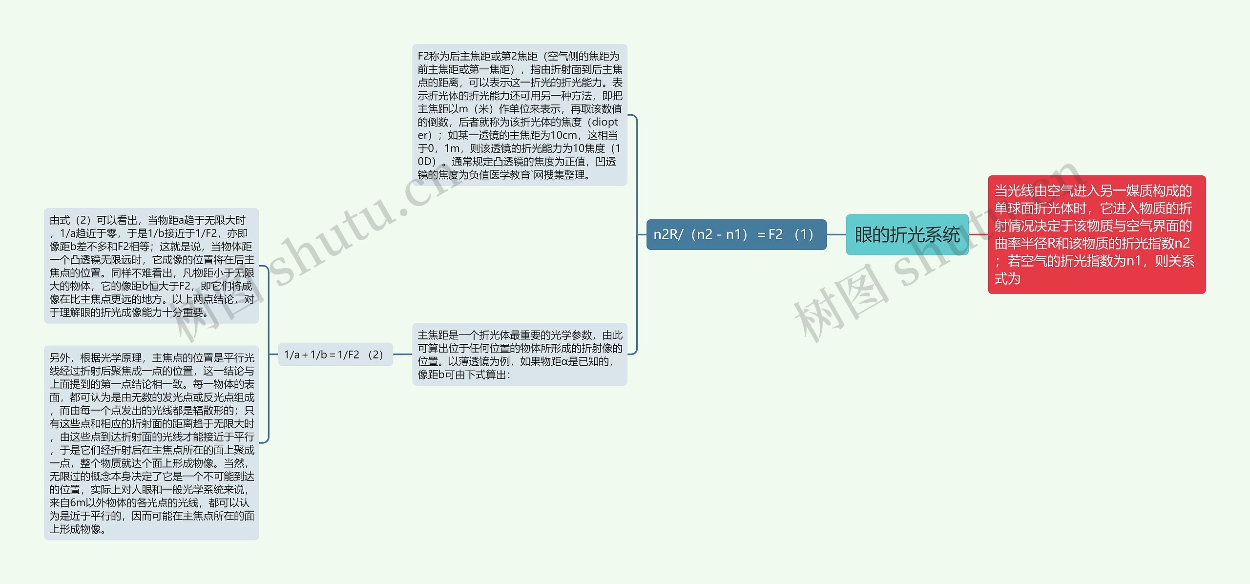 当光线由空气进入另一媒质构成的单球面折光体时,它进入物质的折射情况决定于该物质与空气界面的曲率半径R和该物质的折光指数n2;若空气的折光指数为n1,则关系式为 n2R/(n2-n1)=F2 (1) F2称为后主焦距或第2焦距(空气侧的焦距为前主焦距或第一焦距),指由折射面到后主焦点的距离,可以表示这一折光的折