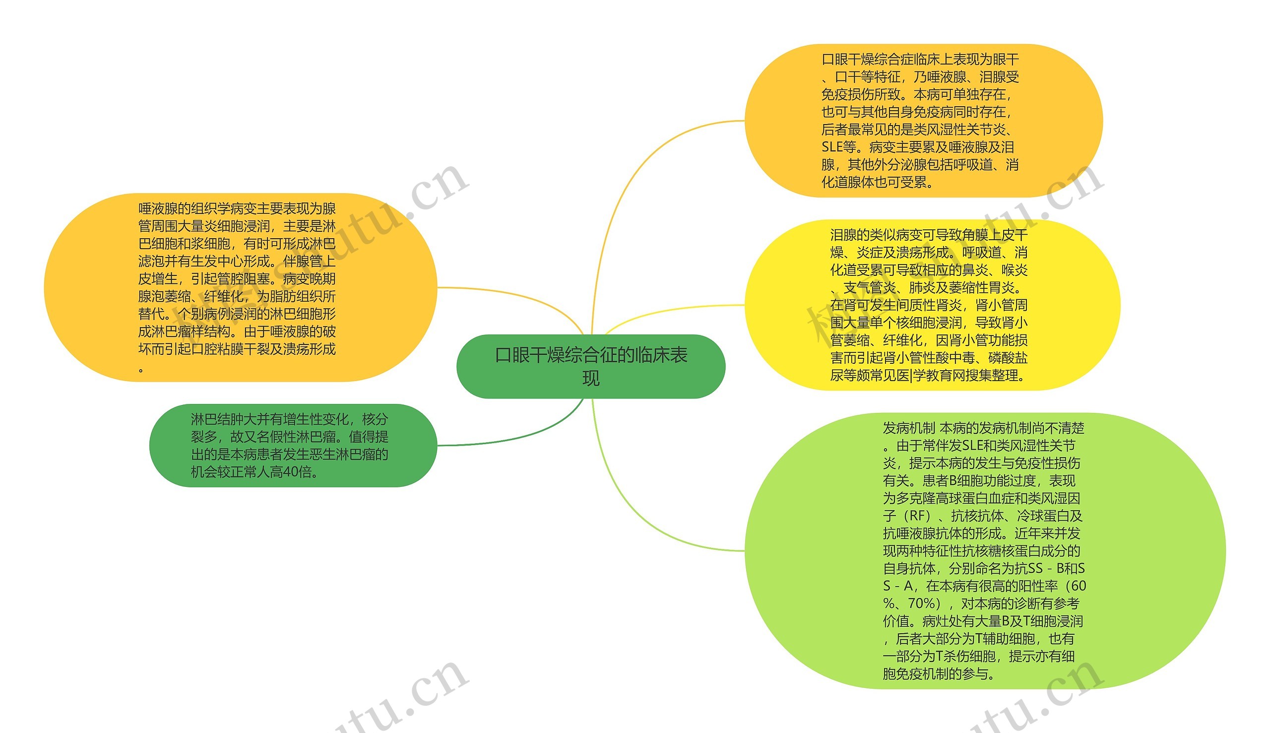 发病机制 本病的发病机制尚不清楚。由于常伴发SLE和类风湿性关节炎,提示本病的发生与免疫性损伤有关。患者B细胞功能过度,表现为多克隆高球蛋白血症和类风湿因子(RF)、抗核抗体、冷球蛋白及抗唾液腺抗体的形成。近年来并发现两种特征性抗核糖核蛋白成分的自身抗体,分别命名为抗SS-B和SS-A,在本病有很高的阳性率(60%、70%),对本病的诊断有参考价值。病灶处有大量B及T细胞浸润,后者大部分为T辅助细胞,也有一部分为T杀伤细胞,提示亦有细胞免疫机制的参与。