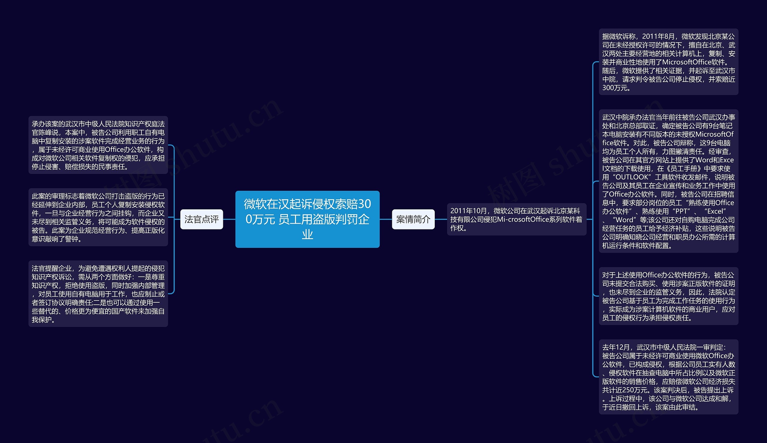 据微软诉称,2011年8月,微软发现北京某公司在未经授权许可的情况下,擅自在北京、武汉两处主要经营地的相关计算机上,复制、安装并商业性地使用了MicrosoftOffice软件。随后,微软提供了相关证据,并起诉至武汉市中院,请求判令被告公司停止侵权,并索赔近300万元。