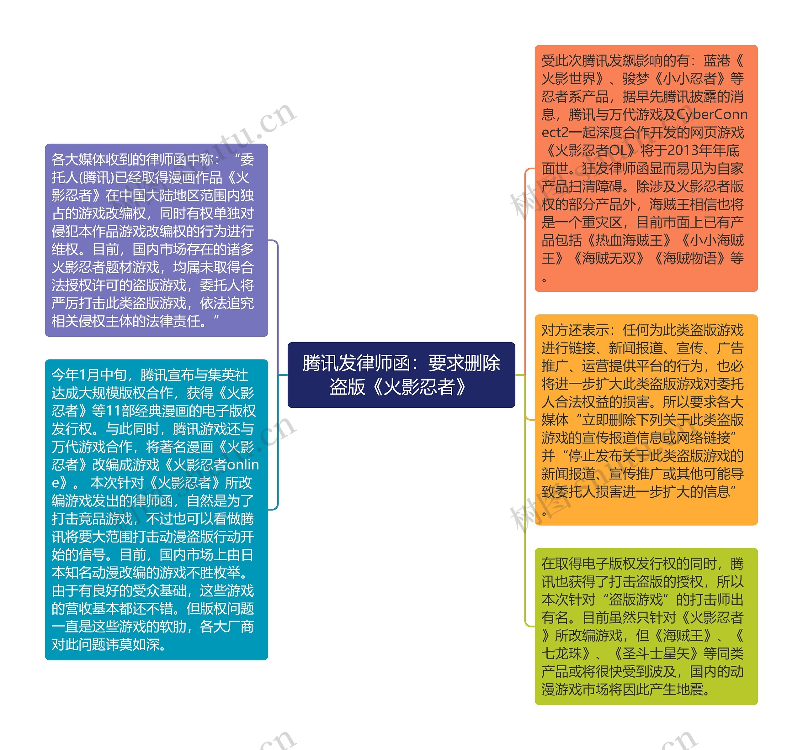 各大媒体收到的律师函中称:“委托人(腾讯)已经取得漫画作品《火影忍者》在中国大陆地区范围内独占的游戏改编权,同时有权单独对侵犯本作品游戏改编权的行为进行维权。目前,国内市场存在的诸多火影忍者题材游戏,均属未取得合法授权许可的盗版游戏,委托人将严厉打击此类盗版游戏,依法追究相关侵权主体的法律责任。”