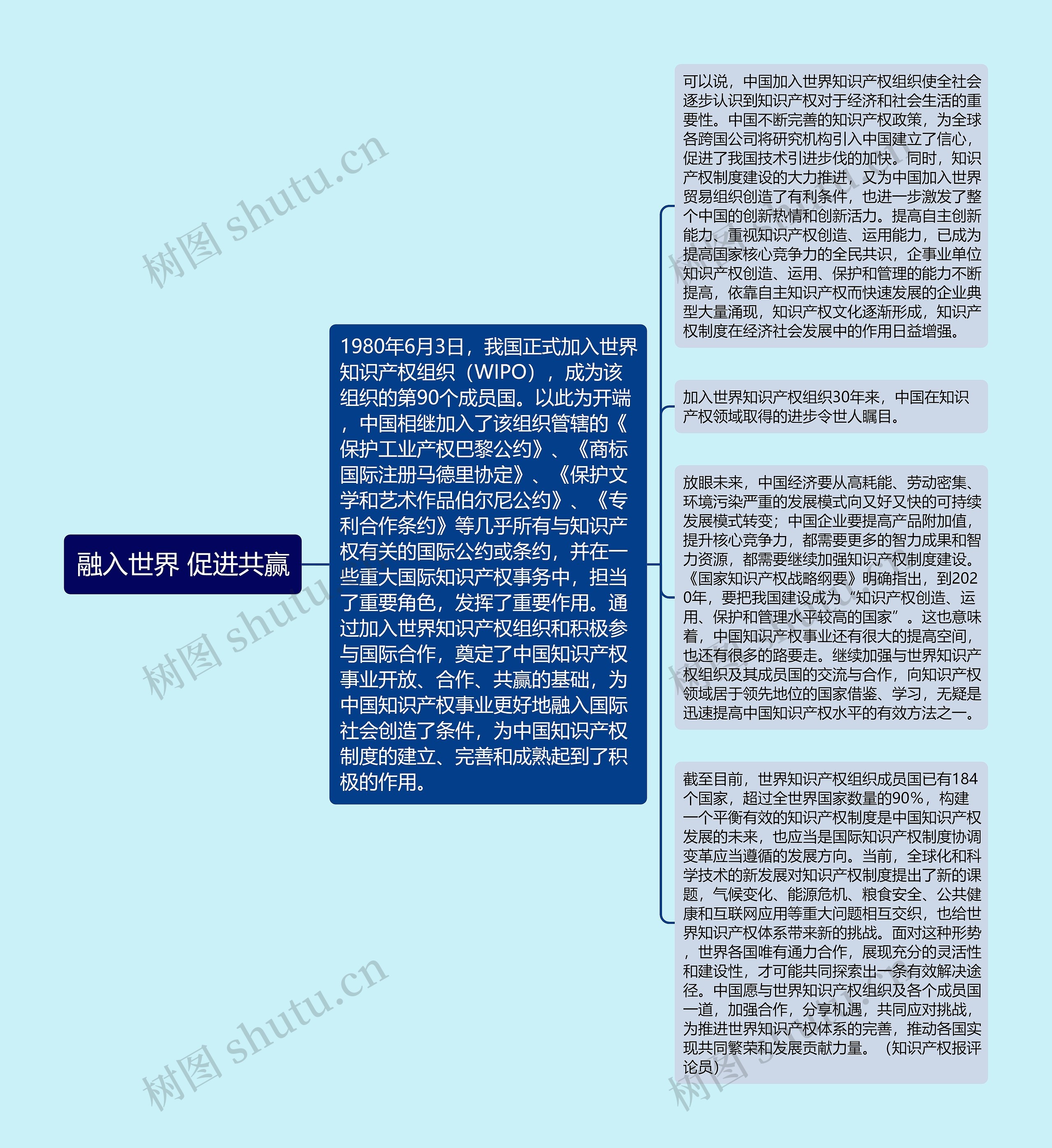 可以说,中国加入世界知识产权组织使全社会逐步认识到知识产权对于经济和社会生活的重要性。中国不断完善的知识产权政策,为全球各跨国公司将研究机构引入中国建立了信心,促进了我国技术引进步伐的加快。同时,知识产权制度建设的大力推进,又为中国加入世界贸易组织创造了有利条件,也进一步激发了整个中国的创新热情和创新活力。提高自主创新能力、重视知识产权创造、运用能力,已成为提高国家核心竞争力的全民共识,企事业单位知识产权创造、运用、保护和管理的能力不断提高,依靠自主知识产权而快速发展的企业典型大量涌现,知识产权文化逐渐形成,知识产权制度在经济社会发展中的作用日益增强。