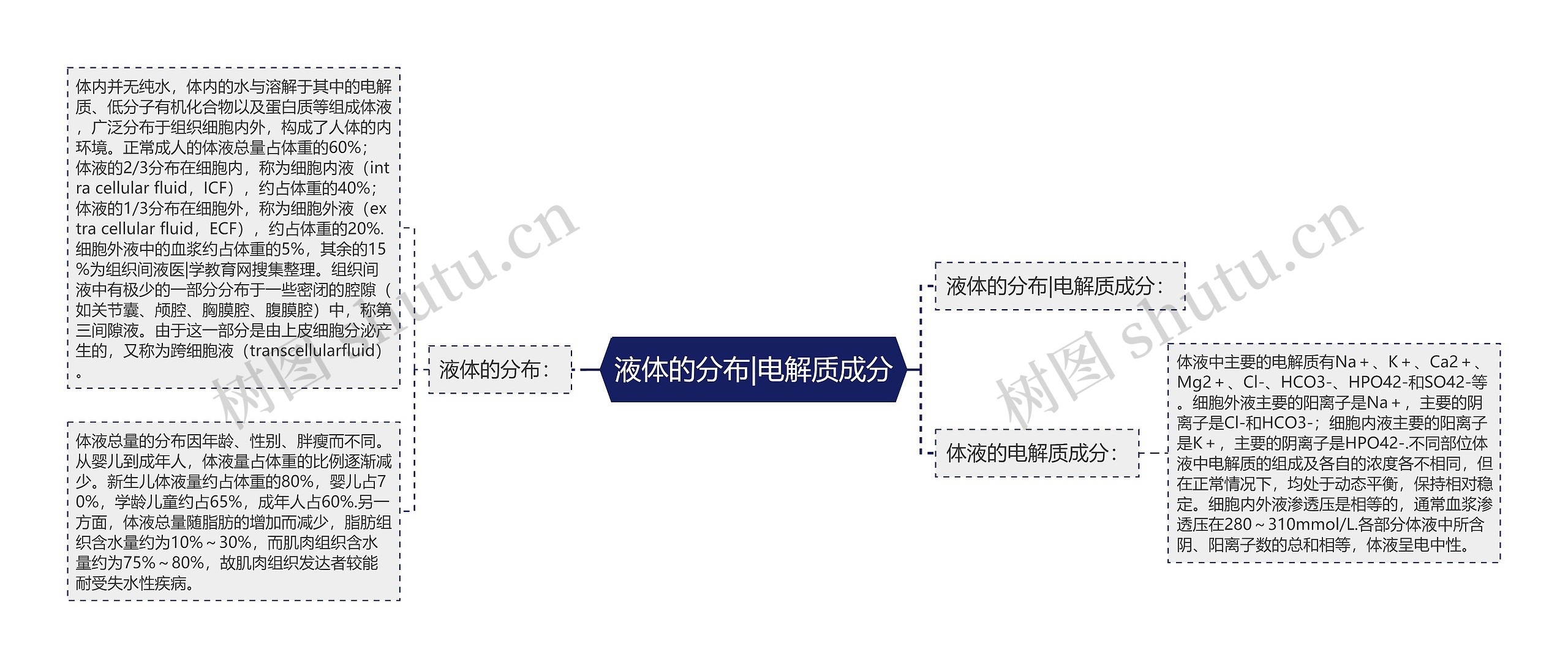 液体的分布|电解质成分: 液体的分布: 体内并无纯水,体内的水与溶解于其中的电解质、低分子有机化合物以及蛋白质等组成体液,广泛分布于组织细胞内外,构成了人体的内环境。
