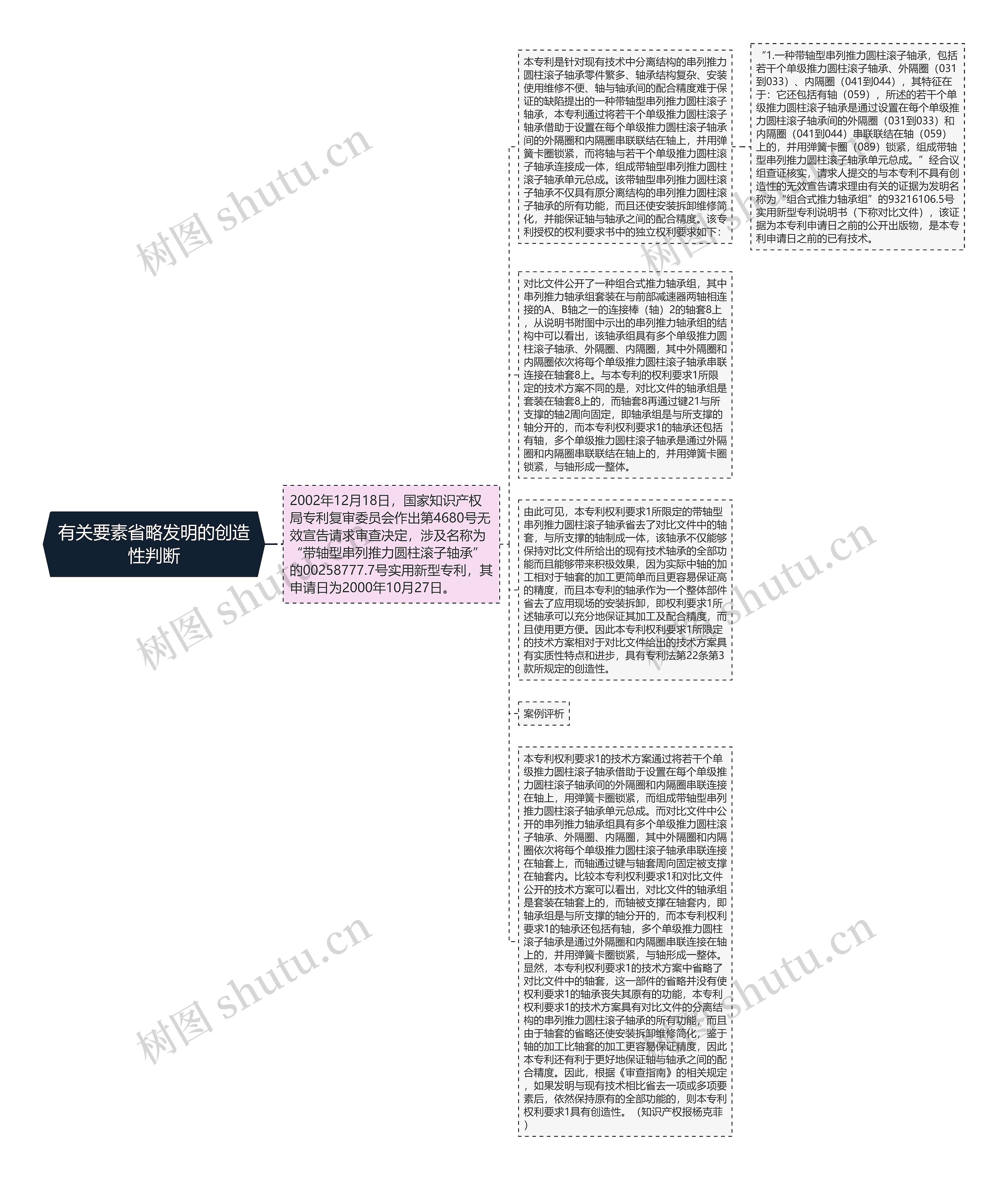 本专利权利要求1的技术方案通过将若干个单级推力圆柱滚子轴承借助于设置在每个单级推力圆柱滚子轴承间的外隔圈和内隔圈串联连接在轴上,用弹簧卡圈锁紧,而组成带轴型串列推力圆柱滚子轴承单元总成。而对比文件中公开的串列推力轴承组具有多个单级推力圆柱滚子轴承、外隔圈、内隔圈,其中外隔圈和内隔圈依次将每个单级推力圆柱滚子轴承串联连接在轴套上,而轴通过键与轴套周向固定被支撑在轴套内。比较本专利权利要求1和对比文件公开的技术方案可以看出,对比文件的轴承组是套装在轴套上的,而轴被支撑在轴套内,即轴承组是与所支撑的轴分开的,而本专利权利要求1的轴承还包括有轴,多个单级推力圆柱滚子轴承是通过外隔圈和内隔圈串联连接在轴上的,并用弹簧卡圈锁紧,与轴形成一整体。显然,本专利权利要求1的技术方案中省略了对比文件中的轴套,这一部件的省略并没有使权利要求1的轴承丧失其原有的功能,本专利权利要求1的技术方案具有对比文件的分离结构的串列推力圆柱滚子轴承的所有功能,而且由于轴套的省略还使安装拆卸维修简化,鉴于轴的加工比轴套的加工更容易保证精度,因此本专利还有利于更好地保证轴与轴承之间的配合精度。因此,根据《审查指南》的相关规定,如果发明与现有技术相比省去一项或多项要素后,依然保持原有的全部功能的,则本专利权利要求1具有创造性。(知识产权报杨克菲)