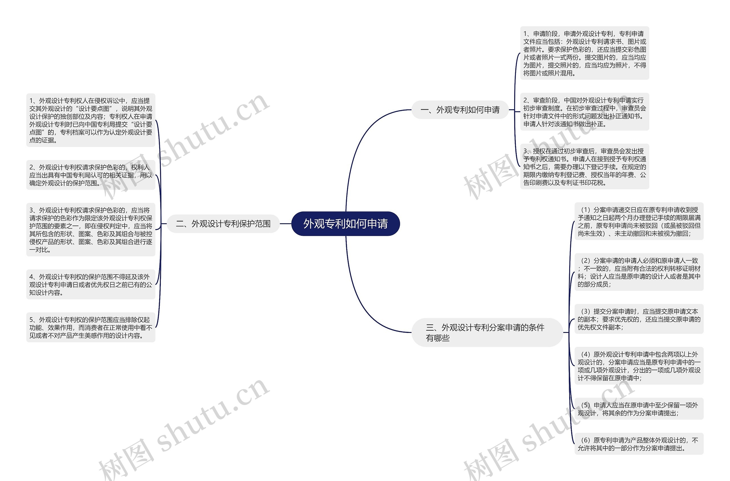 树图思维导图提供《外观专利如何申请》在线思维导图免费制作,点击“编辑”按钮,可对《外观专利如何申请》进行在线思维导图编辑,本思维导图属于思维导图模板主题,文件编号是:627b8c95d503e4c261afb287684fed76