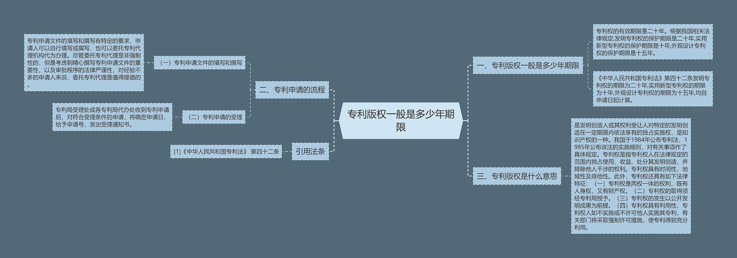 树图思维导图提供《专利版权一般是多少年期限》在线思维导图免费制作,点击“编辑”按钮,可对《专利版权一般是多少年期限》进行在线思维导图编辑,本思维导图属于思维导图模板主题,文件编号是:f198d7d9edfebf5158afc7207635df56