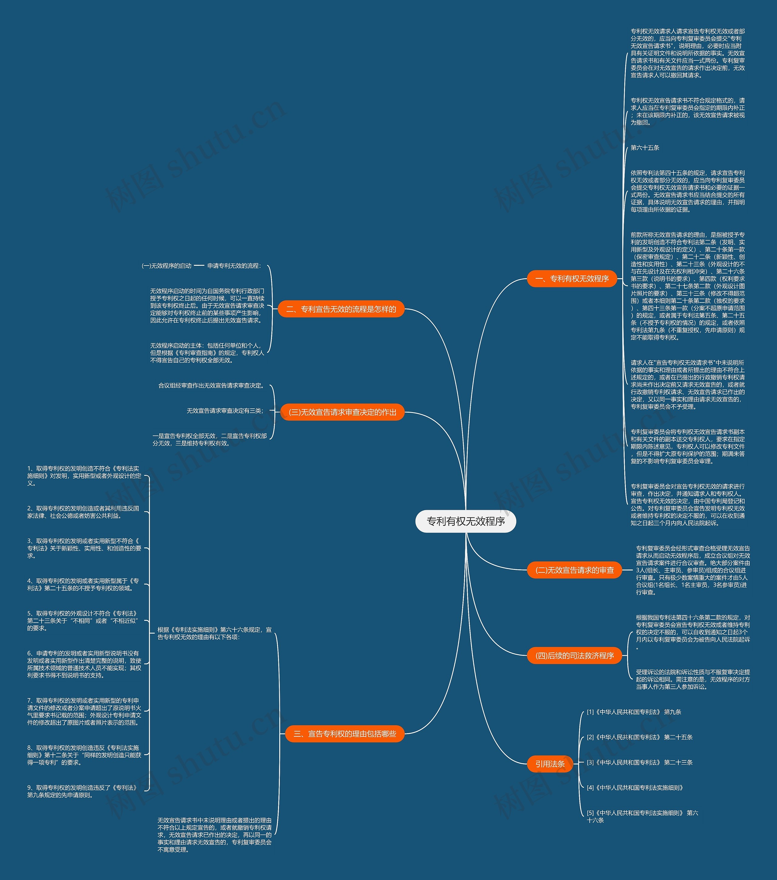前款所称无效宣告请求的理由,是指被授予专利的发明创造不符合专利法第二条(发明、实用新型及外观设计的定义)、第二十条第一款(保密审查规定)、第二十二条(新颖性、创造性和实用性)、第二十三条(外观设计的不与在先设计及在先权利相冲突)、第二十六条第三款(说明书的要求)、第四款(权利要求书的要求)、第二十七条第二款(外观设计图片照片的要求)、第三十三条(修改不得超范围)或者本细则第二十条第二款(独权的要求)、第四十三条第一款(分案不超原申请范围)的规定,或者属于专利法第五条、第二十五条(不授予专利权的情况)的规定,或者依照专利法第九条(不重复授权,先申请原则)规定不能取得专利权。