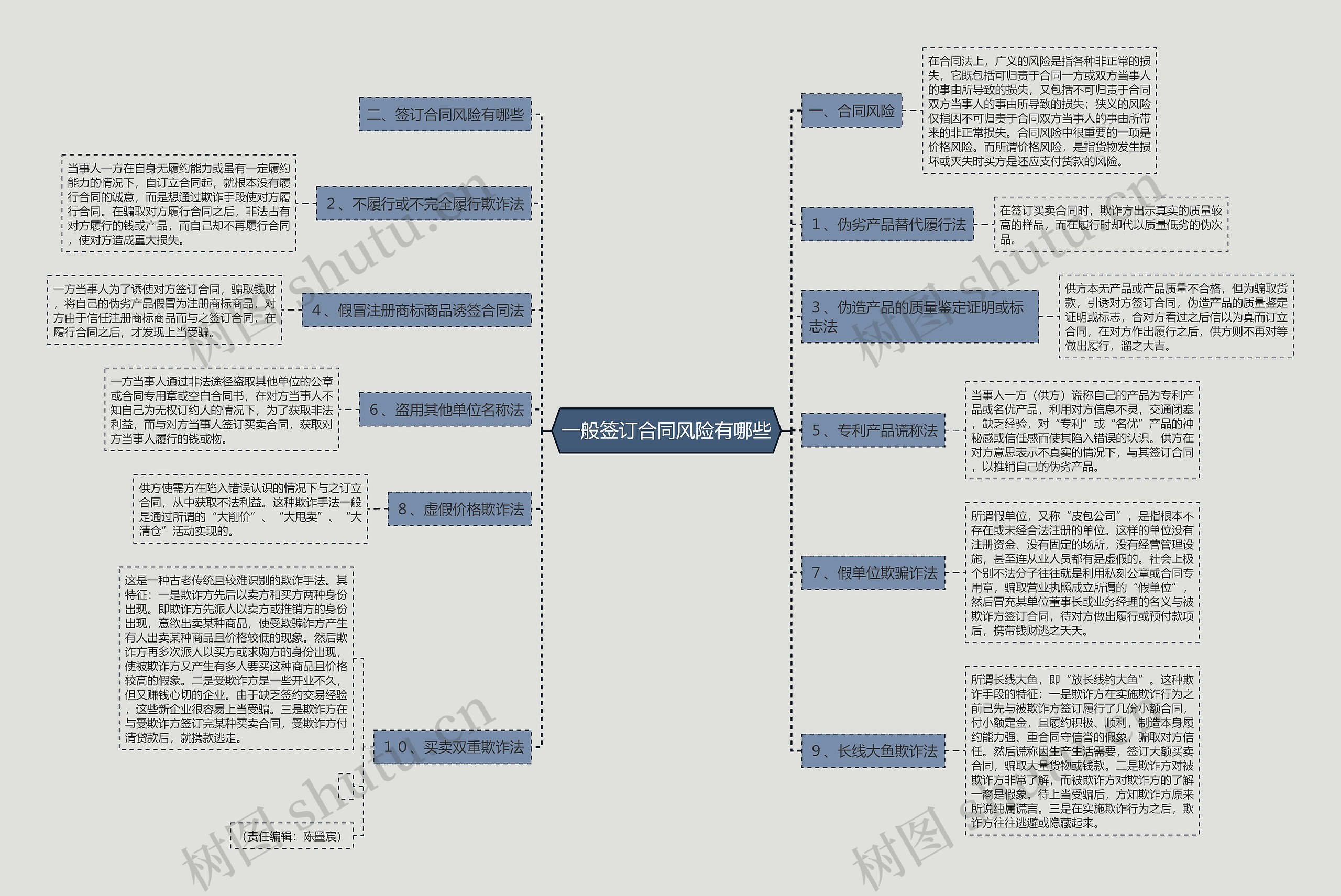 树图思维导图提供《一般签订合同风险有哪些》在线思维导图免费制作,点击“编辑”按钮,可对《一般签订合同风险有哪些》进行在线思维导图编辑,本思维导图属于思维导图模板主题,文件编号是:95670c34656ee630989ebb6b1707505b