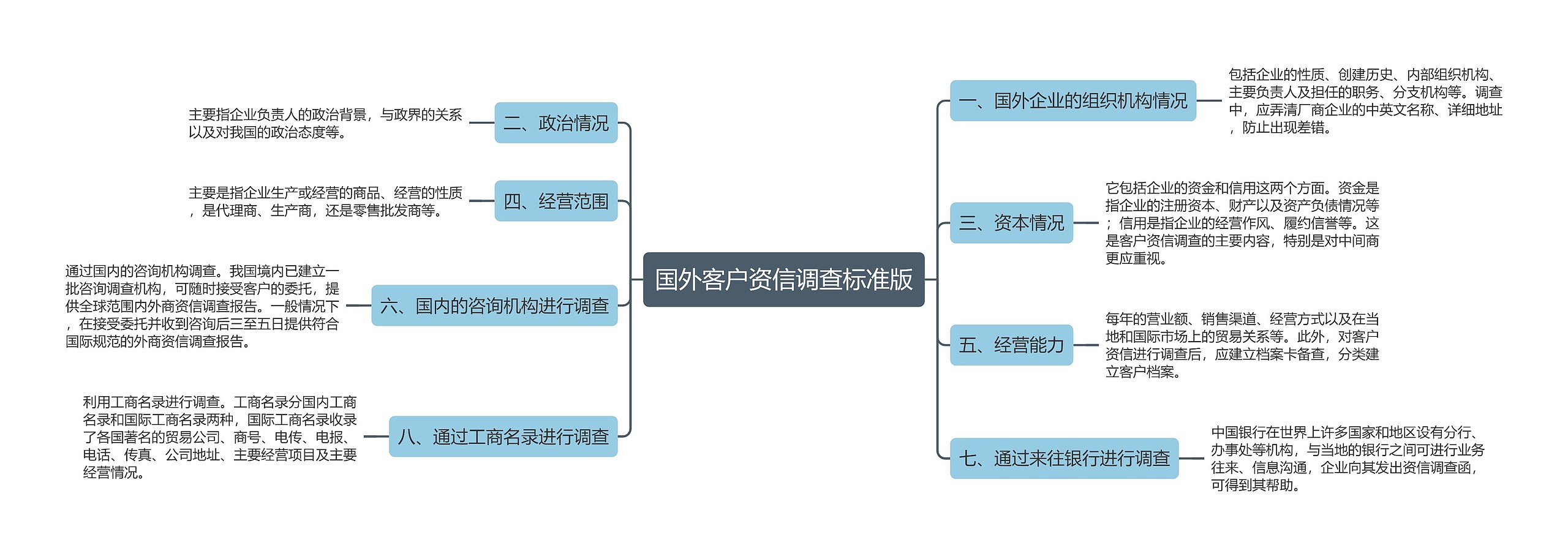 树图思维导图提供《国外客户资信调查标准版》在线思维导图免费制作,点击“编辑”按钮,可对《国外客户资信调查标准版》进行在线思维导图编辑,本思维导图属于思维导图模板主题,文件编号是:812815ca8cc005b8388772cd3ad6177d