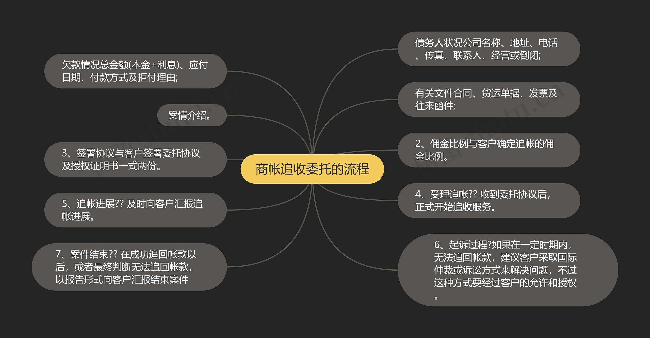 树图思维导图提供《商帐追收委托的流程》在线思维导图免费制作,点击“编辑”按钮,可对《商帐追收委托的流程》进行在线思维导图编辑,本思维导图属于思维导图模板主题,文件编号是:f459f2d68c9997f26368a447a55a322b