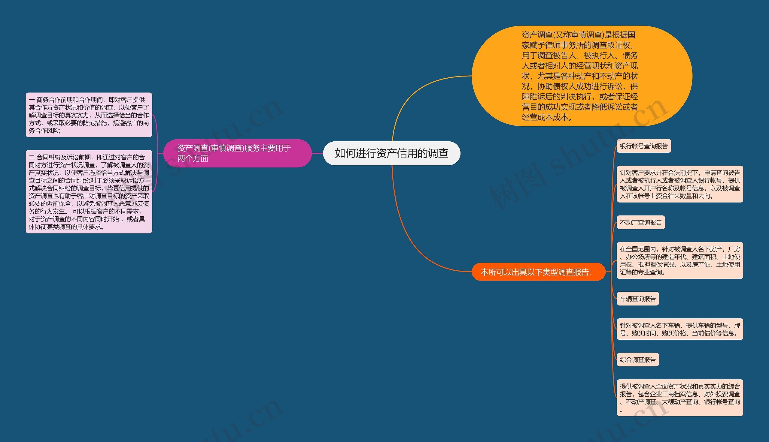 树图思维导图提供《如何进行资产信用的调查》在线思维导图免费制作,点击“编辑”按钮,可对《如何进行资产信用的调查》进行在线思维导图编辑,本思维导图属于思维导图模板主题,文件编号是:cd8c2a92fe6fb9f3733863af30207443