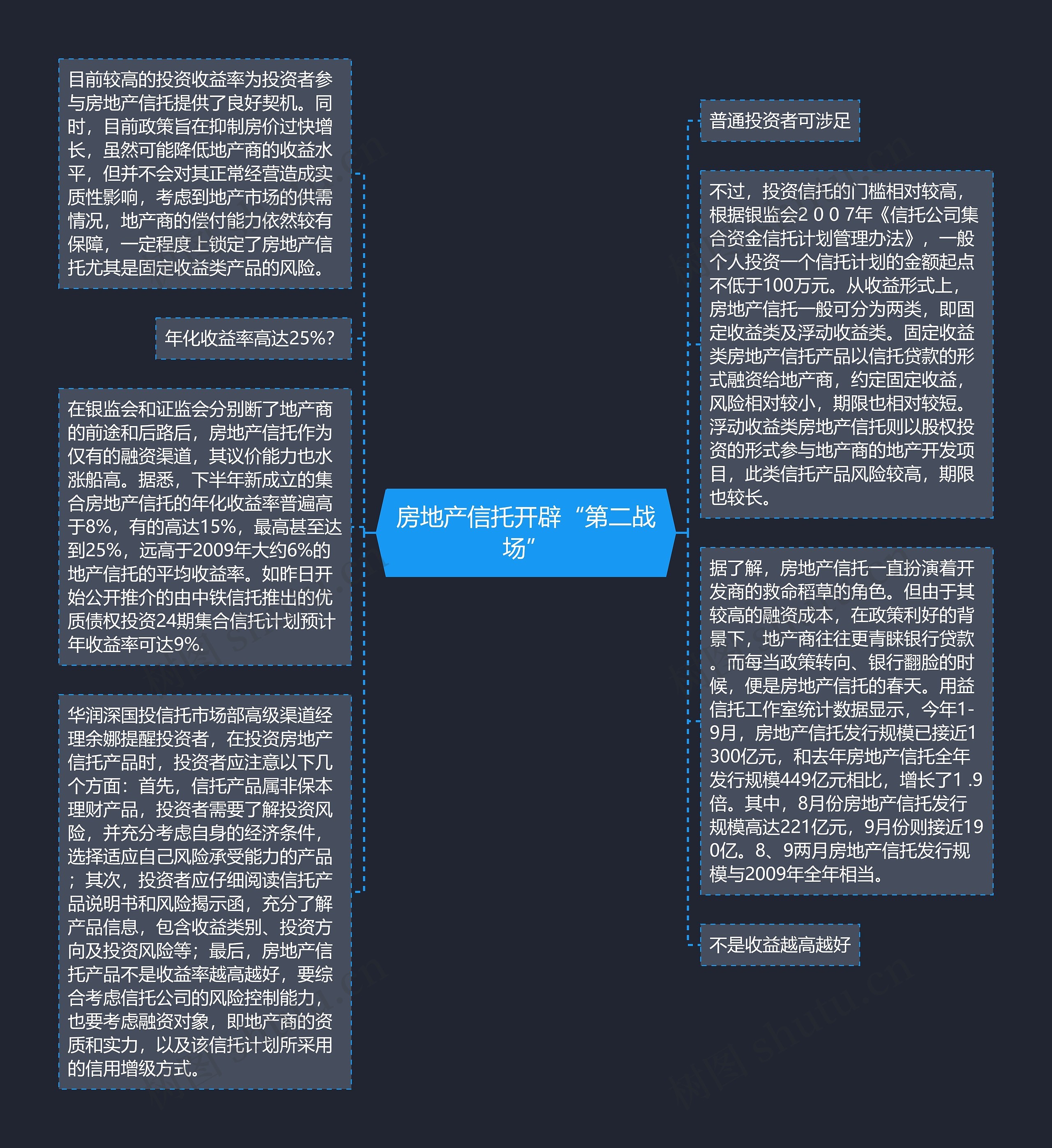 华润深国投信托市场部高级渠道经理余娜提醒投资者,在投资房地产信托产品时,投资者应注意以下几个方面:首先,信托产品属非保本理财产品,投资者需要了解投资风险,并充分考虑自身的经济条件,选择适应自己风险承受能力的产品;其次,投资者应仔细阅读信托产品说明书和风险揭示函,充分了解产品信息,包含收益类别、投资方向及投资风险等;最后,房地产信托产品不是收益率越高越好,要综合考虑信托公司的风险控制能力,也要考虑融资对象,即地产商的资质和实力,以及该信托计划所采用的信用增级方式。