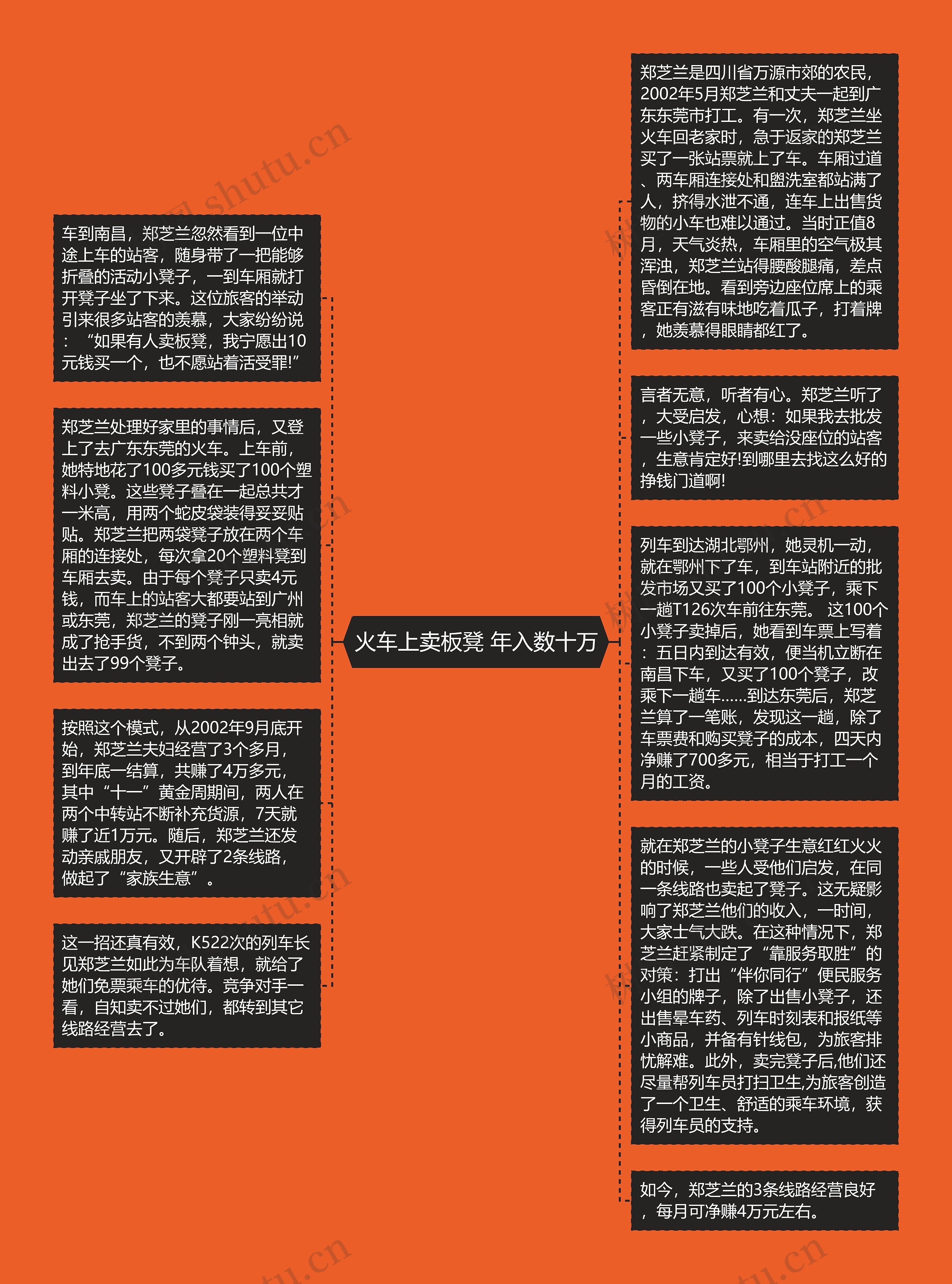 郑芝兰处理好家里的事情后,又登上了去广东东莞的火车。上车前,她特地花了100多元钱买了100个塑料小凳。这些凳子叠在一起总共才一米高,用两个蛇皮袋装得妥妥贴贴。郑芝兰把两袋凳子放在两个车厢的连接处,每次拿20个塑料凳到车厢去卖。由于每个凳子只卖4元钱,而车上的站客大都要站到广州或东莞,郑芝兰的凳子刚一亮相就成了抢手货,不到两个钟头,就卖出去了99个凳子。