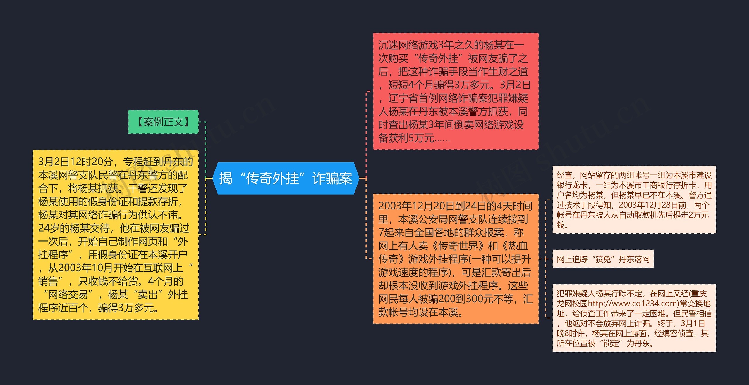 沉迷网络游戏3年之久的杨某在一次购买“传奇外挂”被网友骗了之后,把这种诈骗手段当作生财之道,短短4个月骗得3万多元。3月2日,辽宁省首例网络诈骗案犯罪嫌疑人杨某在丹东被本溪警方抓获,同时查出杨某3年间倒卖网络游戏设备获利5万元……