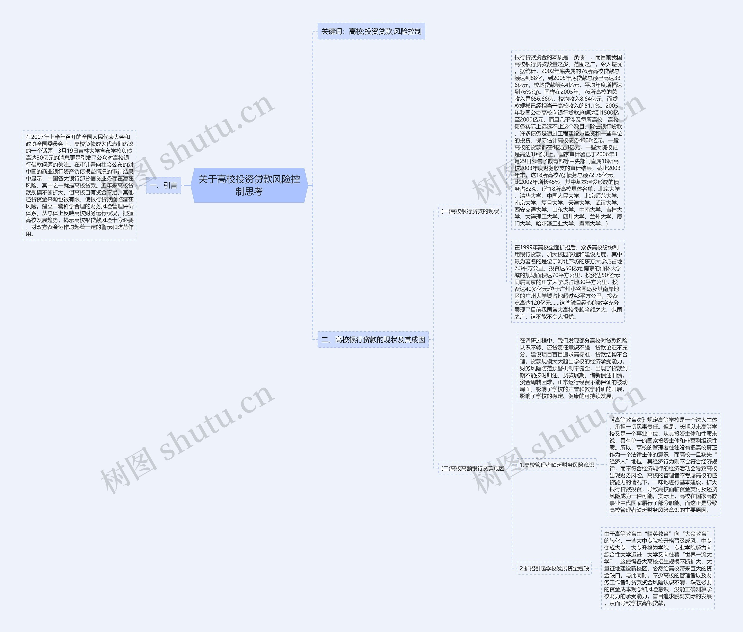 树图思维导图提供《关于高校投资贷款风险控制思考》在线思维导图免费制作,点击“编辑”按钮,可对《关于高校投资贷款风险控制思考》进行在线思维导图编辑,本思维导图属于思维导图模板主题,文件编号是:1535f3fb56bb181a0922546175306a6f