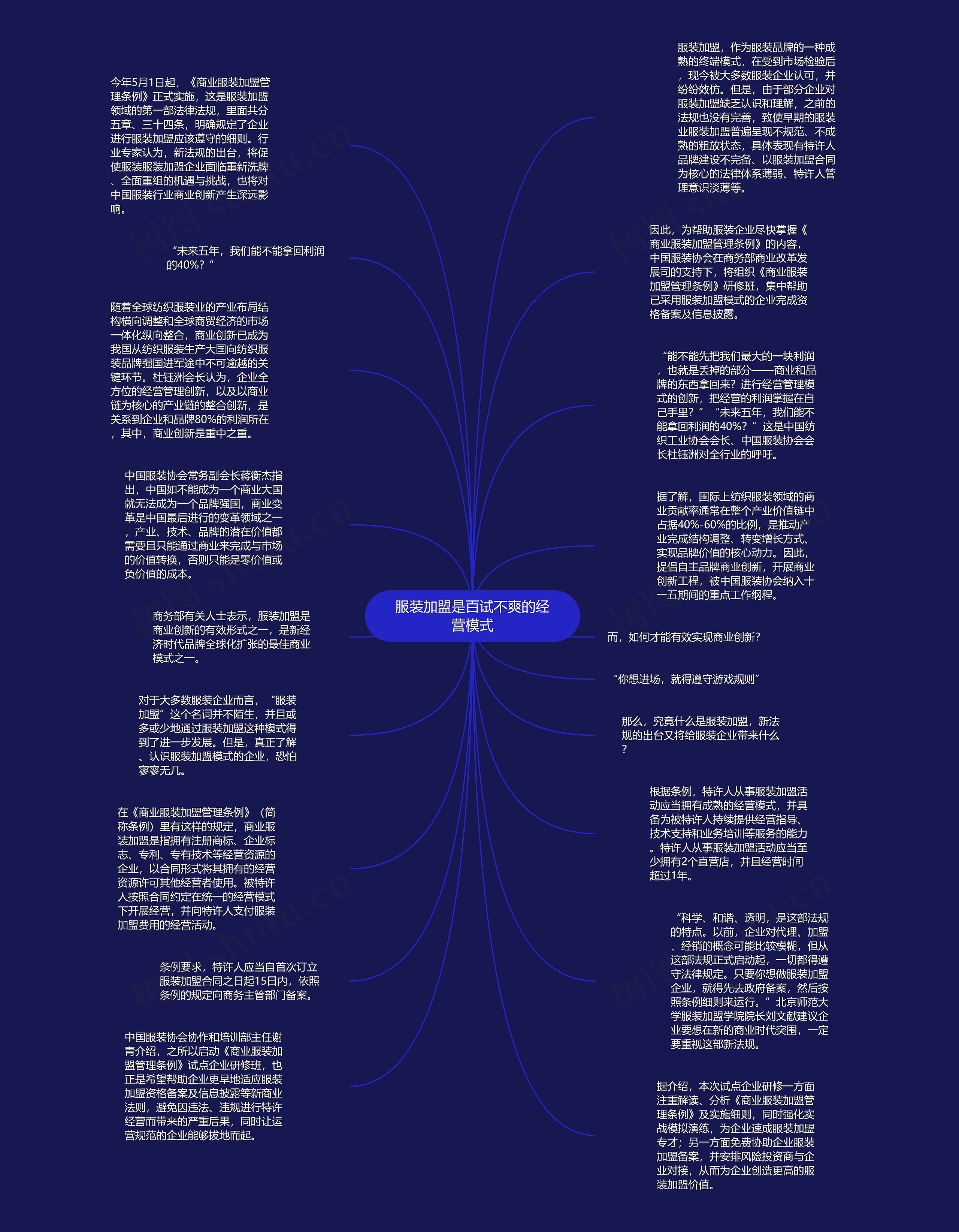“科学、和谐、透明,是这部法规的特点。以前,企业对代理、加盟、经销的概念可能比较模糊,但从这部法规正式启动起,一切都得遵守法律规定。只要你想做服装加盟企业,就得先去政府备案,然后按照条例细则来运行。”北京师范大学服装加盟学院院长刘文献建议企业要想在新的商业时代突围,一定要重视这部新法规。