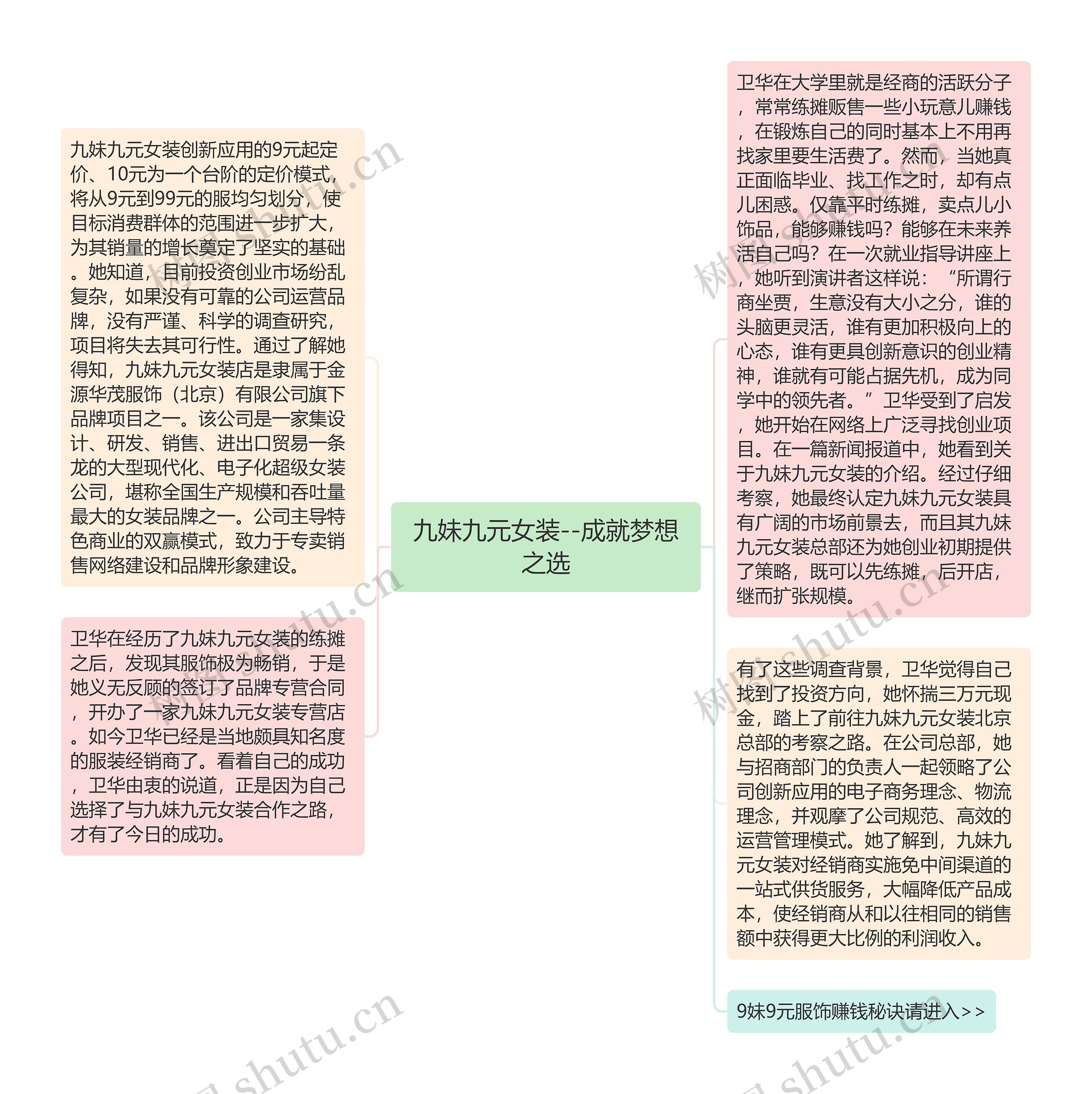 卫华在大学里就是经商的活跃分子,常常练摊贩售一些小玩意儿赚钱,在锻炼自己的同时基本上不用再找家里要生活费了。然而,当她真正面临毕业、找工作之时,却有点儿困惑。仅靠平时练摊,卖点儿小饰品,能够赚钱吗?能够在未来养活自己吗?在一次就业指导讲座上,她听到演讲者这样说:“所谓行商坐贾,生意没有大小之分,谁的头脑更灵活,谁有更加积极向上的心态,谁有更具创新意识的创业精神,谁就有可能占据先机,成为同学中的领先者。”卫华受到了启发,她开始在网络上广泛寻找创业项目。在一篇新闻报道中,她看到关于九妹九元女装的介绍。经过仔细考察,她最终认定九妹九元女装具有广阔的市场前景去,而且其九妹九元女装总部还为她创业初期提供了策略,既可以先练摊,后开店,继而扩张规模。