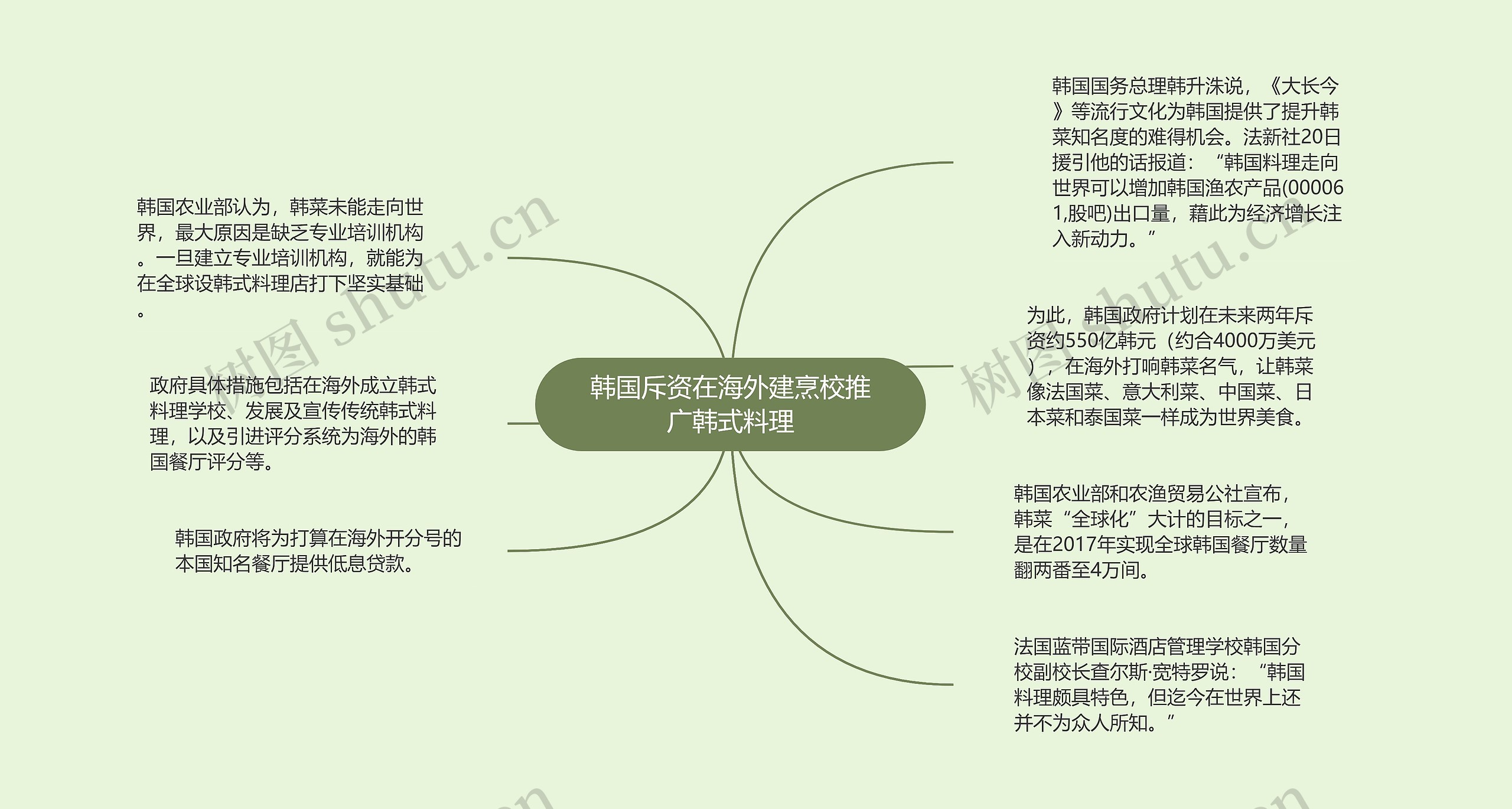 为此,韩国政府计划在未来两年斥资约550亿韩元(约合4000万美元),在海外打响韩菜名气,让韩菜像法国菜、意大利菜、中国菜、日本菜和泰国菜一样成为世界美食。
