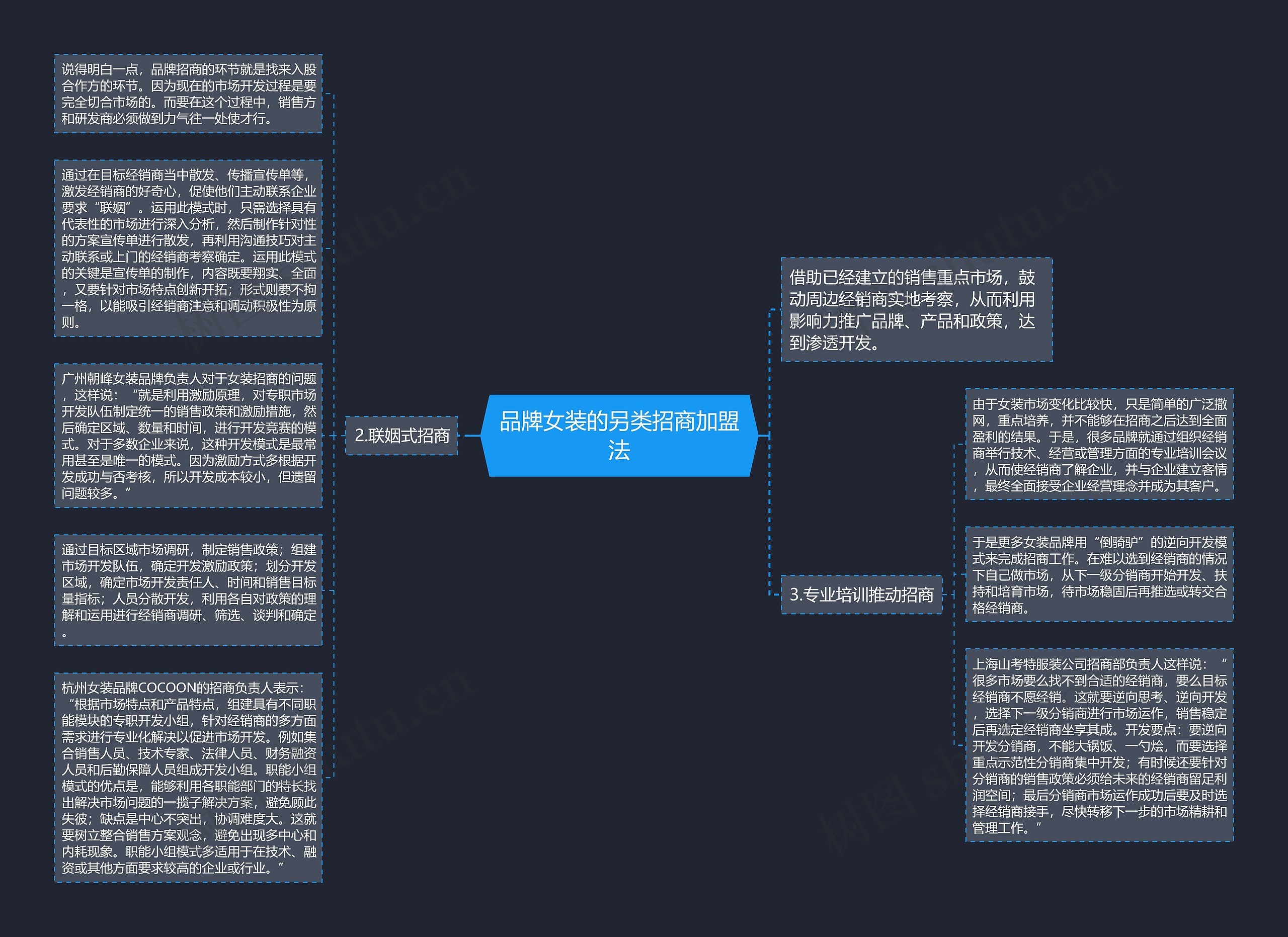 广州朝峰女装品牌负责人对于女装招商的问题,这样说:“就是利用激励原理,对专职市场开发队伍制定统一的销售政策和激励措施,然后确定区域、数量和时间,进行开发竞赛的模式。对于多数企业来说,这种开发模式是最常用甚至是唯一的模式。因为激励方式多根据开发成功与否考核,所以开发成本较小,但遗留问题较多。”