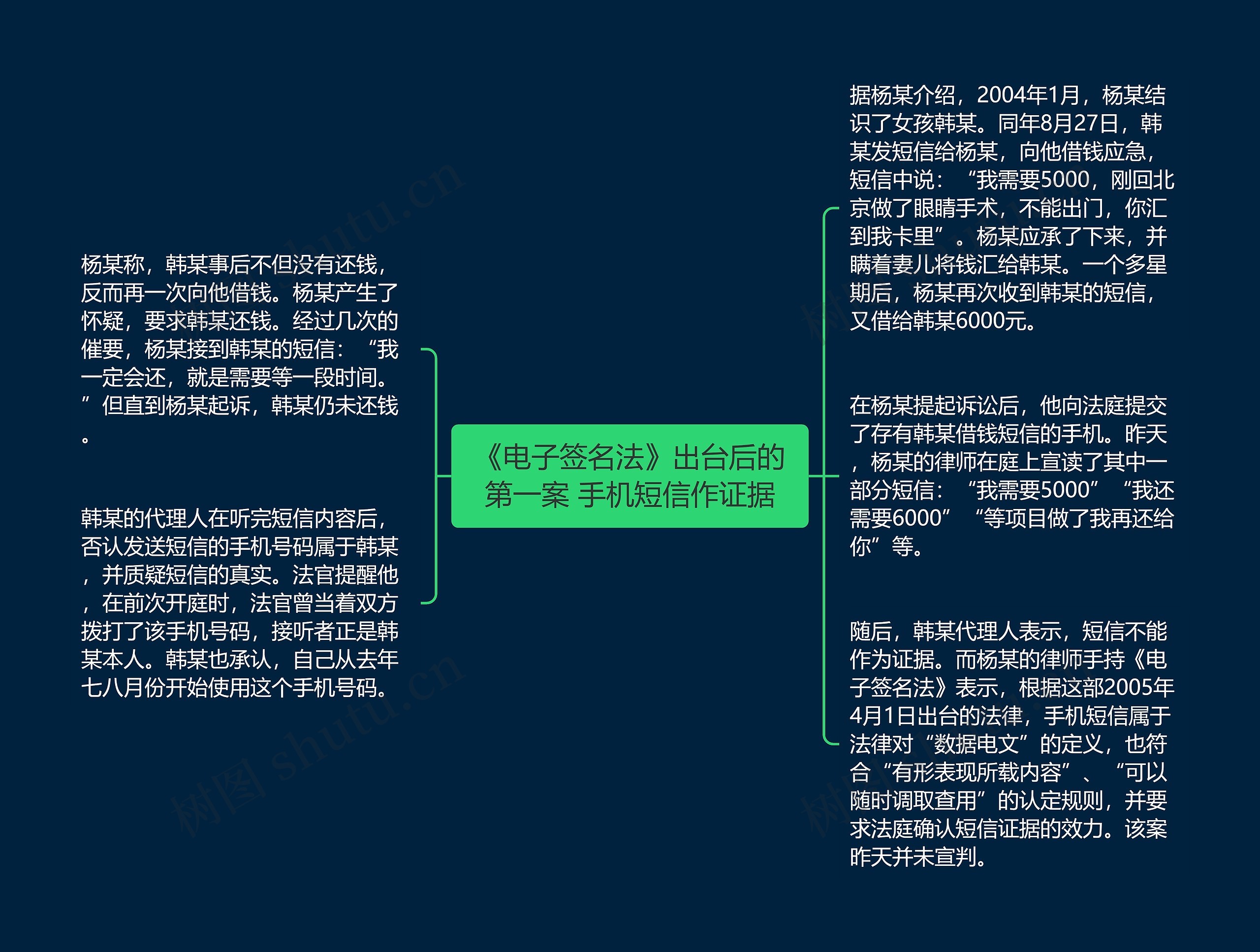 随后,韩某代理人表示,短信不能作为证据。而杨某的律师手持《电子签名法》表示,根据这部2005年4月1日出台的法律,手机短信属于法律对“数据电文”的定义,也符合“有形表现所载内容”、“可以随时调取查用”的认定规则,并要求法庭确认短信证据的效力。该案昨天并未宣判。