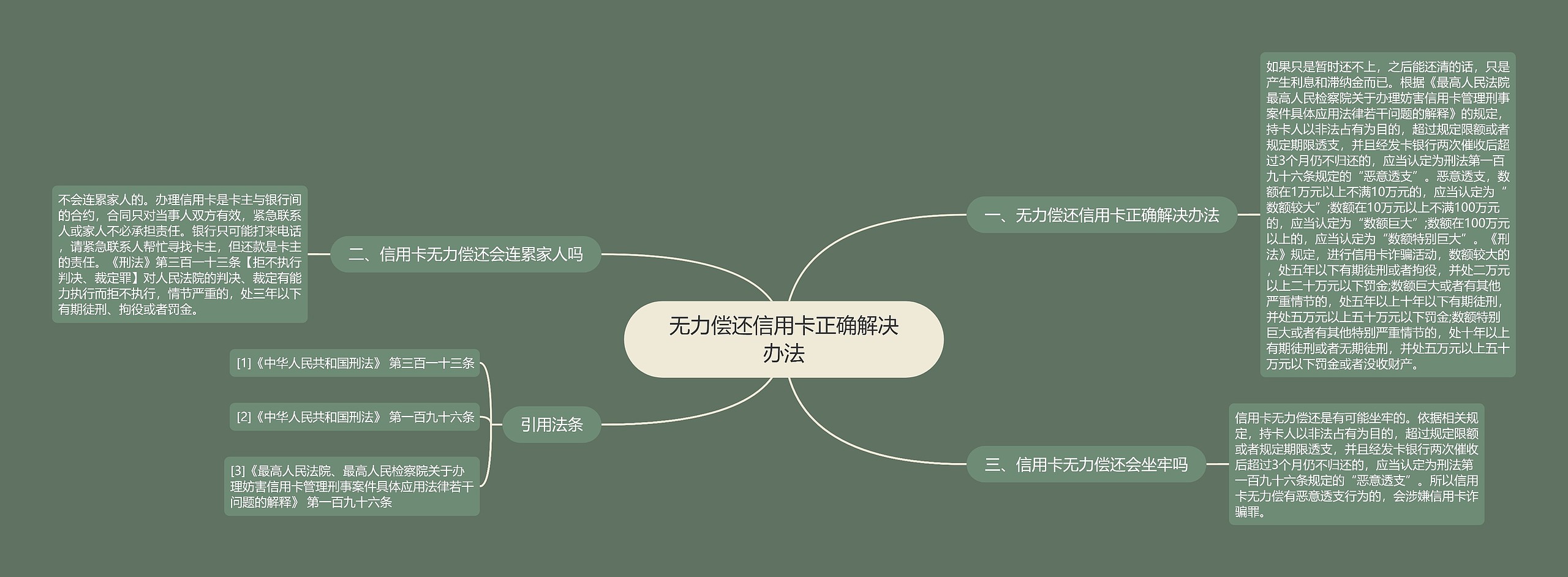 树图思维导图提供《无力偿还信用卡正确解决办法》在线思维导图免费制作,点击“编辑”按钮,可对《无力偿还信用卡正确解决办法》进行在线思维导图编辑,本思维导图属于思维导图模板主题,文件编号是:e23b1cb2d5f3f41182700b6fbeec8794