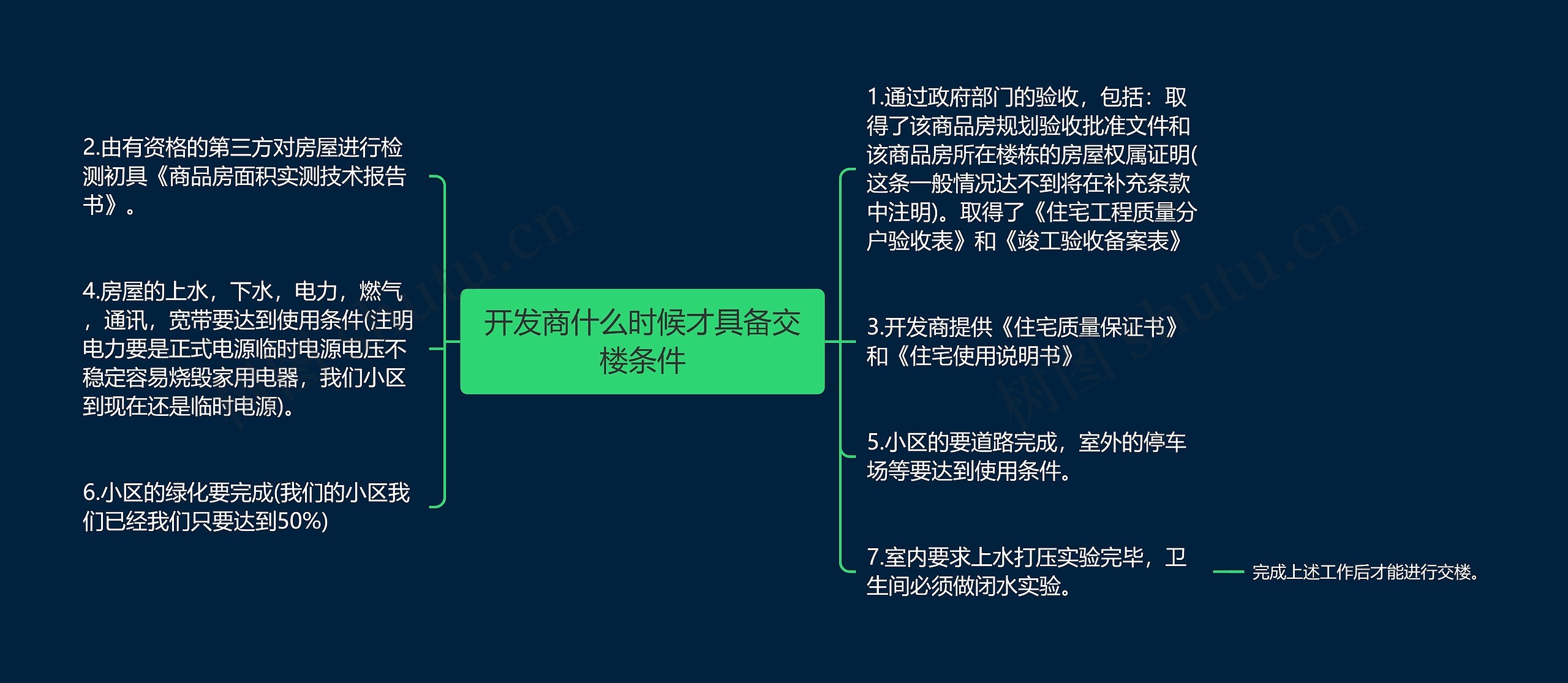 树图思维导图提供《开发商什么时候才具备交楼条件》在线思维导图免费制作,点击“编辑”按钮,可对《开发商什么时候才具备交楼条件》进行在线思维导图编辑,本思维导图属于思维导图模板主题,文件编号是:98c753d1a49ddd8f805381a92dab5a88
