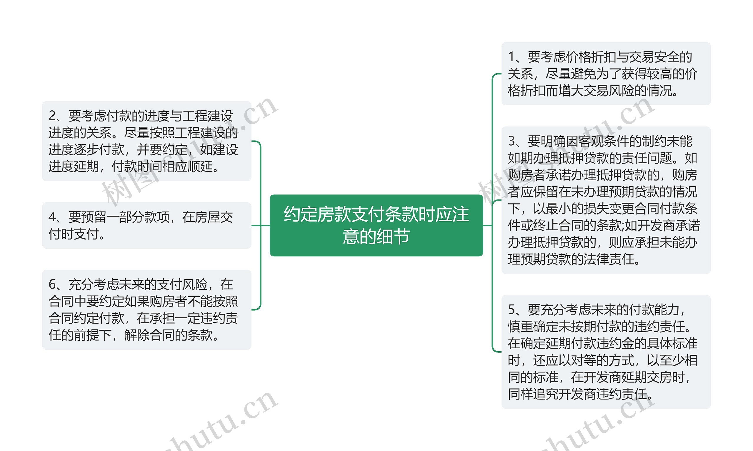 5、要充分考虑未来的付款能力,慎重确定未按期付款的违约责任。在确定延期付款违约金的具体标准时,还应以对等的方式,以至少相同的标准,在开发商延期交房时,同样追究开发商违约责任。