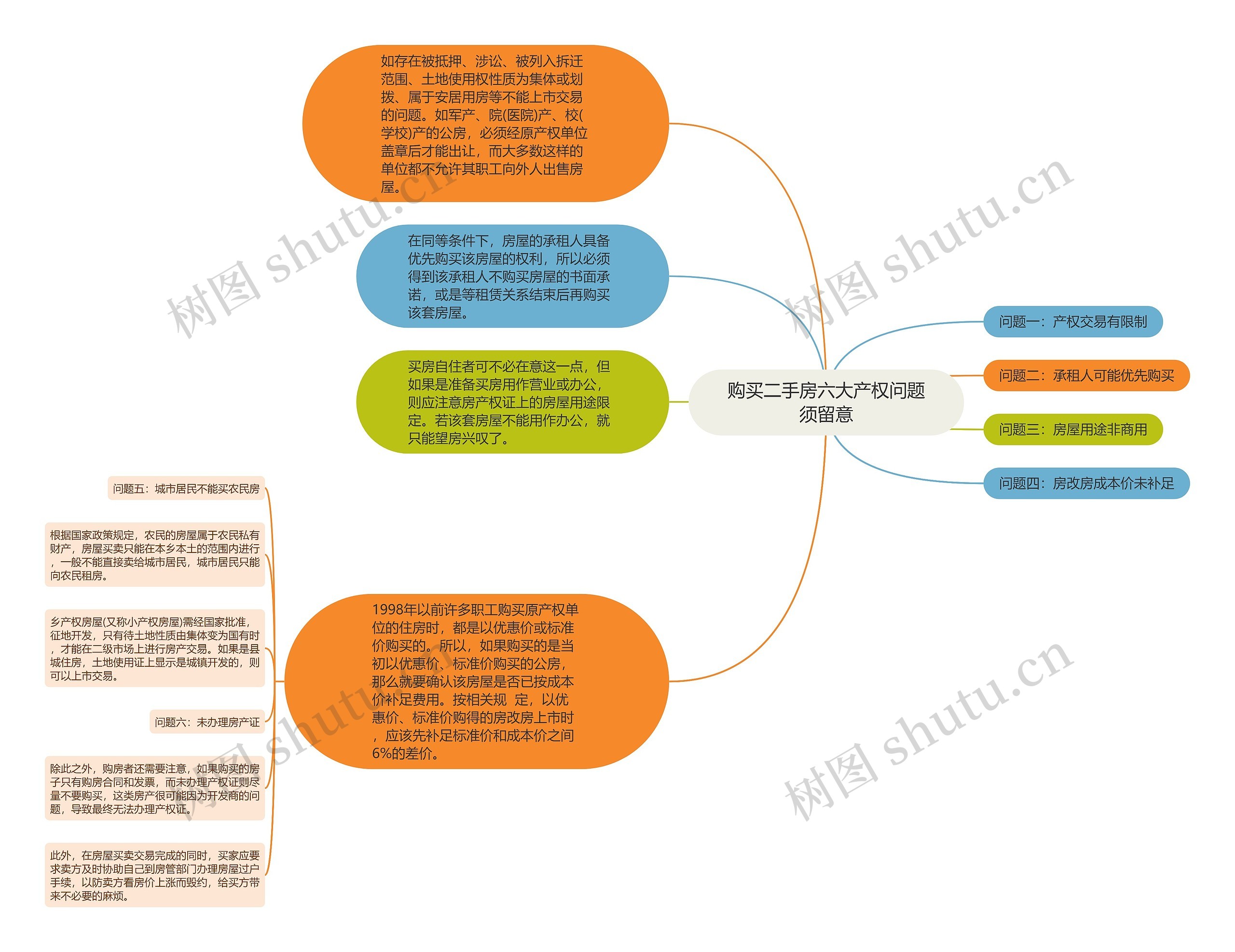 树图思维导图提供《购买二手房六大产权问题须留意》在线思维导图免费制作,点击“编辑”按钮,可对《购买二手房六大产权问题须留意》进行在线思维导图编辑,本思维导图属于思维导图模板主题,文件编号是:cf76aff8fd252d2ae9c55224e9625f63
