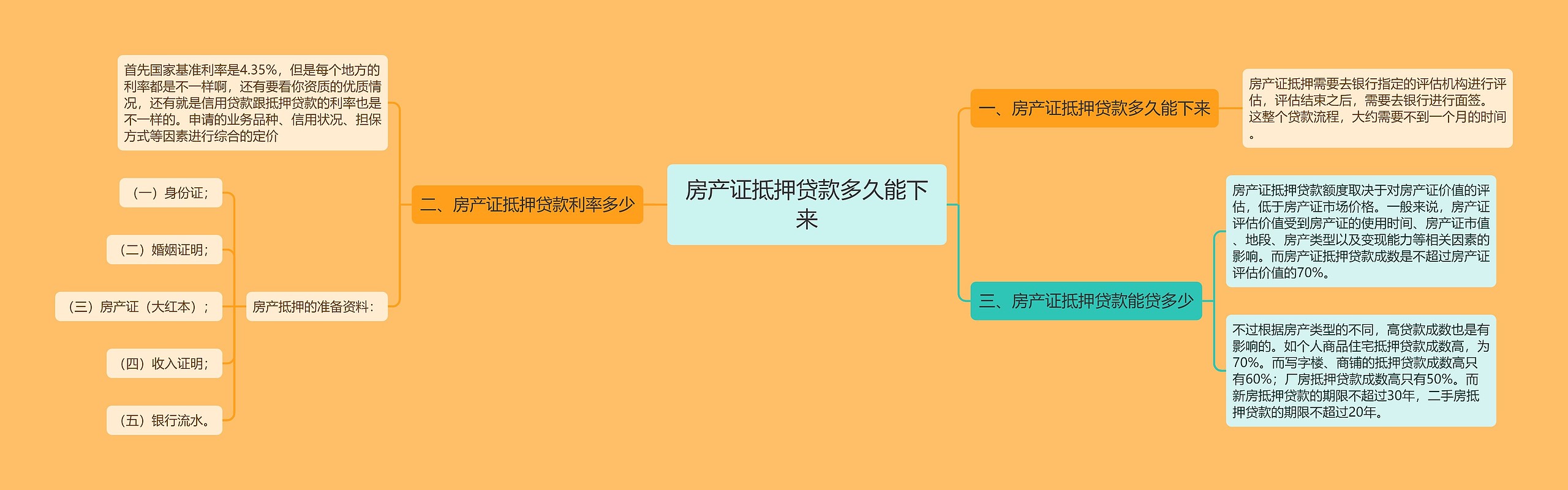 树图思维导图提供《房产证抵押贷款多久能下来》在线思维导图免费制作,点击“编辑”按钮,可对《房产证抵押贷款多久能下来》进行在线思维导图编辑,本思维导图属于思维导图模板主题,文件编号是:387b93765615850700b5c689179c49e1