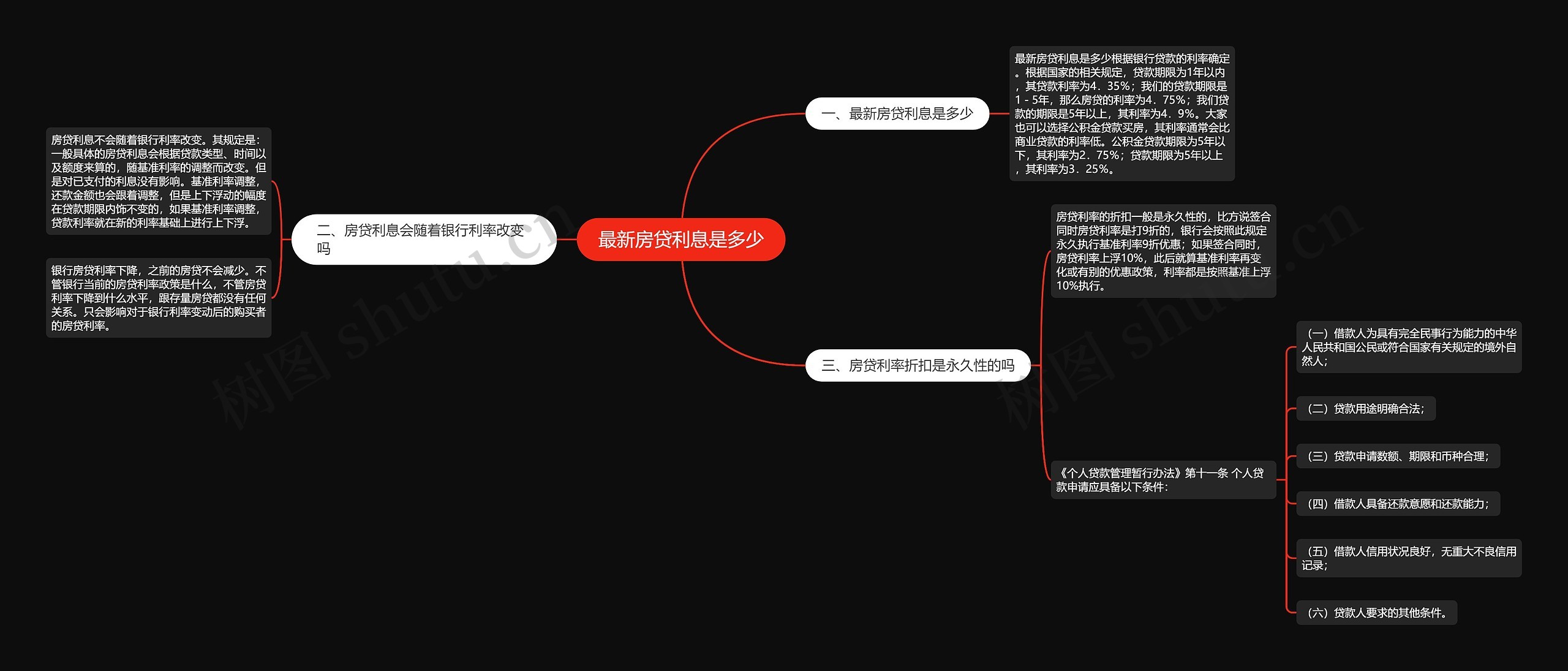 树图思维导图提供《最新房贷利息是多少》在线思维导图免费制作,点击“编辑”按钮,可对《最新房贷利息是多少》进行在线思维导图编辑,本思维导图属于思维导图模板主题,文件编号是:201c98e361f4eeee5a8b545b51327eff