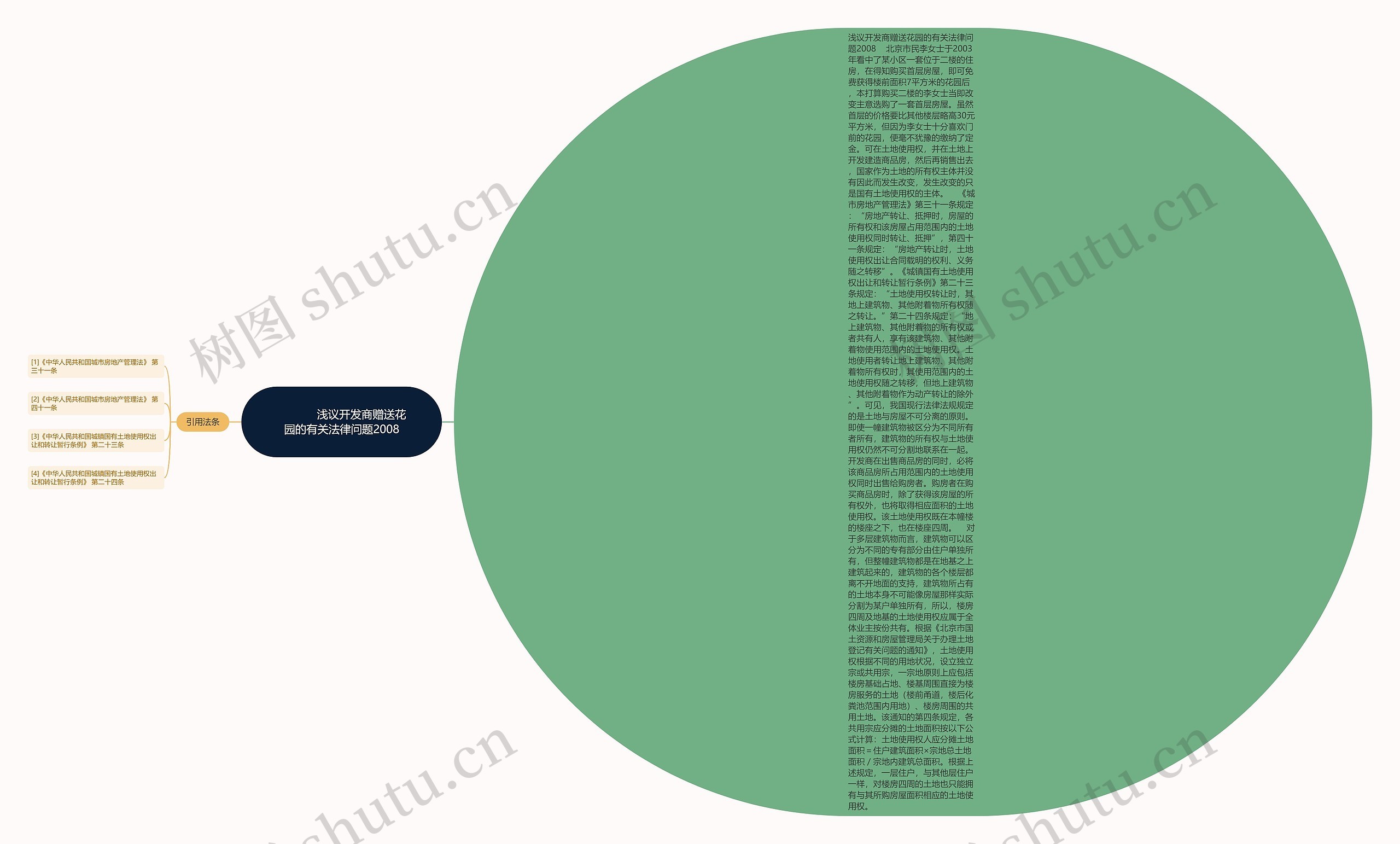 浅议开发商赠送花园的有关法律问题2008 北京市民李女士于2003年看中了某小区一套位于二楼的住房,在得知购买首层房屋,即可免费获得楼前面积7平方米的花园后,本打算购买二楼的李女士当即改变主意选购了一套首层房屋。虽然首层的价格要比其他楼层略高30元平方米,但因为李女士十分喜欢门前的花园,便毫不犹豫的缴纳了定金。可在土地使用权,并在土地上开发建造商品房,然后再销售出去,国家作为土地的所有权主体并没有因此而发生改变,发生改变的只是国有土地使用权的主体。 《城市房地产管理法》第三十一条规定:“房地产转让、抵押时,房屋的所有权和该房屋占用范围内的土地使用权同时转让、抵押”,第四十一条规定:“房地产转让时,土地使用权出让合同载明的权利、义务随之转移”。《城镇国有土地使用权出让和转让暂行条例》第二十三条规定:“土地使用权转让时,其地上建筑物、其他附着物所有权随之转让。”第二十四条规定:“地上建筑物、其他附着物的所有权或者共有人,享有该建筑物、其他附着物使用范围内的土地使用权。土地使用者转让地上建筑物、其他附着物所有权时,其使用范围内的土地使用权随之转移,但地上建筑物、其他附着物作为动产转让的除外”。可见,我国现行法律法规规定的是土地与房屋不可分离的原则。即使一幢建筑物被区分为不同所有者所有,建筑物的所有权与土地使用权仍然不可分割地联系在一起。开发商在出售商品房的同时,必将该商品房所占用范围内的土地使用权同时出售给购房者。购房者在购买商品房时,除了获得该房屋的所有权外,也将取得相应面积的土地使用权。该土地使用权既在本幢楼的楼座之下,也在楼座四周。 对于多层建筑物而言,建筑物可以区分为不同的专有部分由住户单独所有,但整幢建筑物都是在地基之上建筑起来的,建筑物的各个楼层都离不开地面的支持,建筑物所占有的土地本身不可能像房屋那样实际分割为某户单独所有,所以,楼房四周及地基的土地使用权应属于全体业主按份共有。根据《北京市国土资源和房屋管理局关于办理土地登记有关问题的通知》,土地使用权根据不同的用地状况,设立独立宗或共用宗,一宗地原则上应包括楼房基础占地、楼基周围直接为楼房服务的土地(楼前甬道,楼后化粪池范围内用地)、楼房周围的共用土地。该通知的第四条规定,各共用宗应分摊的土地面积按以下公式计算:土地使用权人应分摊土地面积=住户建筑面积×宗地总土地面积/宗地内建筑总面积。根据上述规定,一层住户,与其他层住户一样,对楼房四周的土地也只能拥有与其所购房屋面积相应的土地使用权。