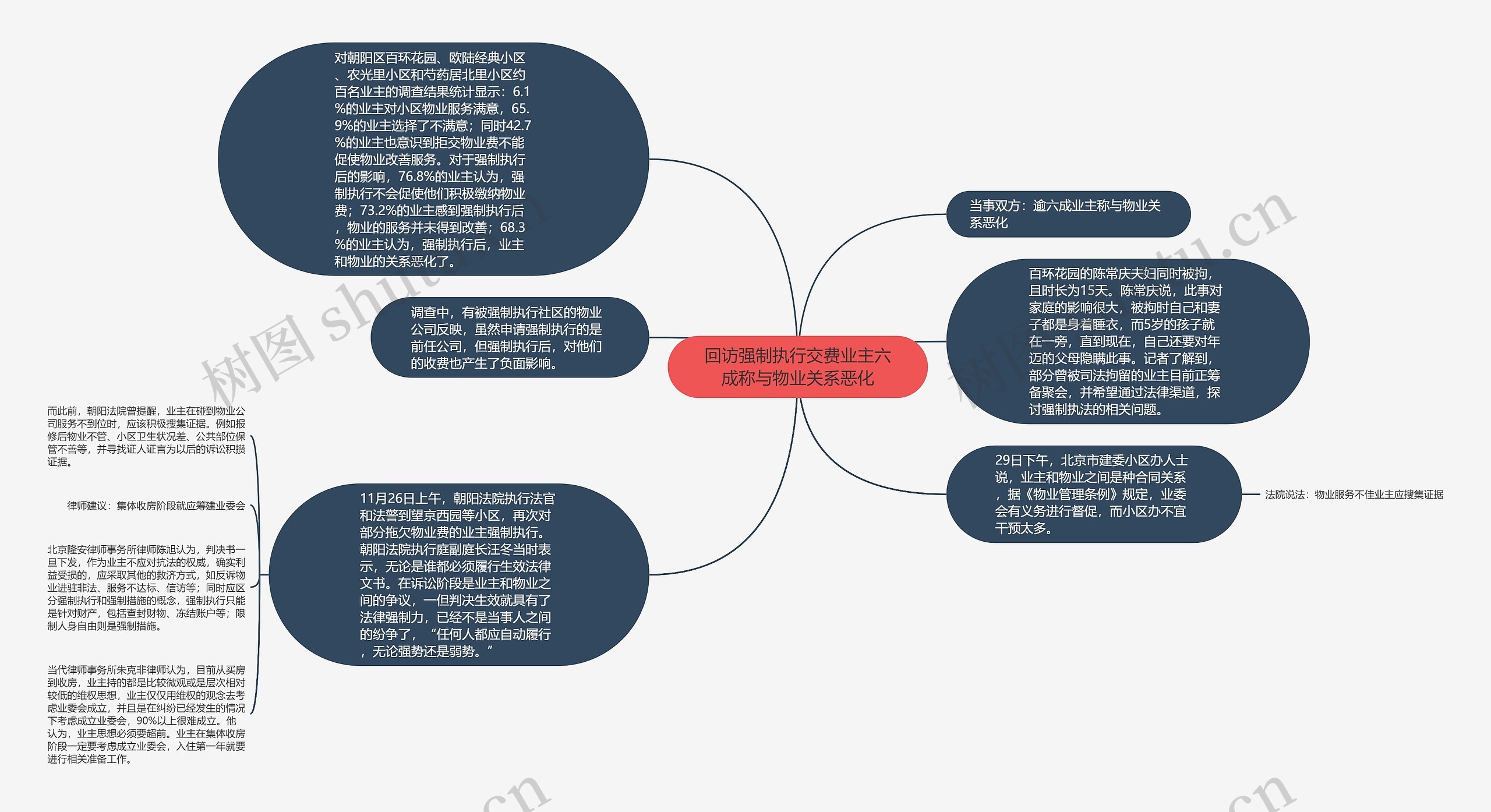 对朝阳区百环花园、欧陆经典小区、农光里小区和芍药居北里小区约百名业主的调查结果统计显示:6.1%的业主对小区物业服务满意,65.9%的业主选择了不满意;同时42.7%的业主也意识到拒交物业费不能促使物业改善服务。对于强制执行后的影响,76.8%的业主认为,强制执行不会促使他们积极缴纳物业费;73.2%的业主感到强制执行后,物业的服务并未得到改善;68.3%的业主认为,强制执行后,业主和物业的关系恶化了。