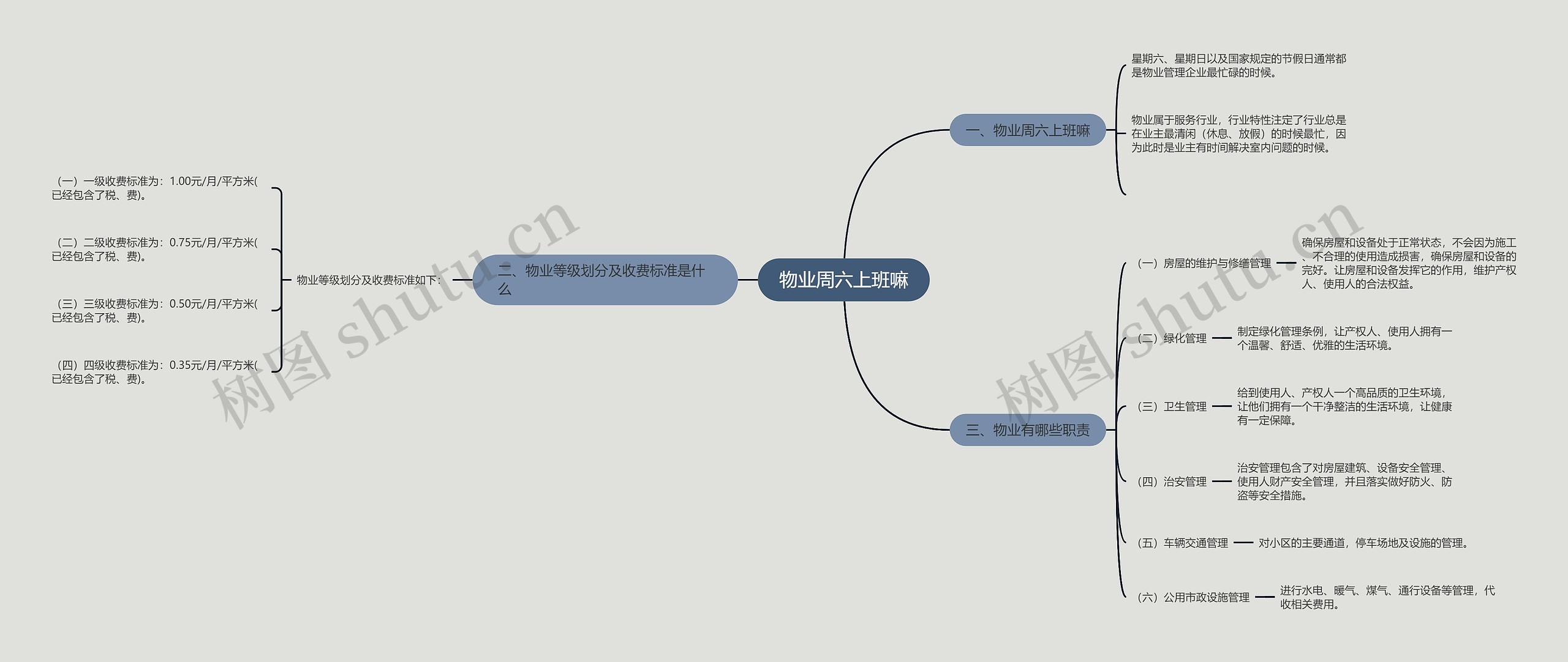 树图思维导图提供《物业周六上班嘛》在线思维导图免费制作,点击“编辑”按钮,可对《物业周六上班嘛》进行在线思维导图编辑,本思维导图属于思维导图模板主题,文件编号是:aedee05ecb7c8b3673b6c915ee4994fa