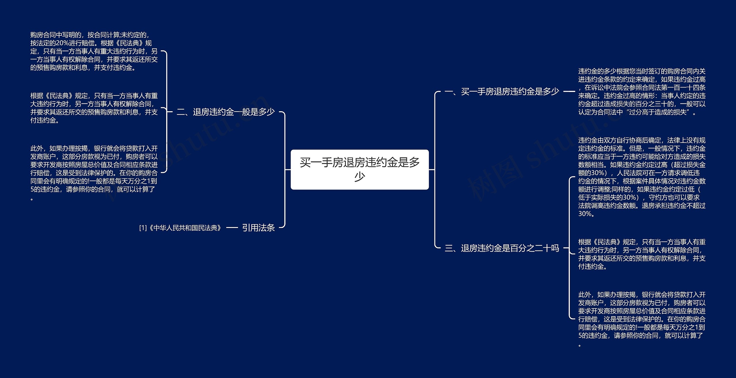 树图思维导图提供《买一手房退房违约金是多少》在线思维导图免费制作,点击“编辑”按钮,可对《买一手房退房违约金是多少》进行在线思维导图编辑,本思维导图属于思维导图模板主题,文件编号是:38b27715375e984cc6e93362912cd959