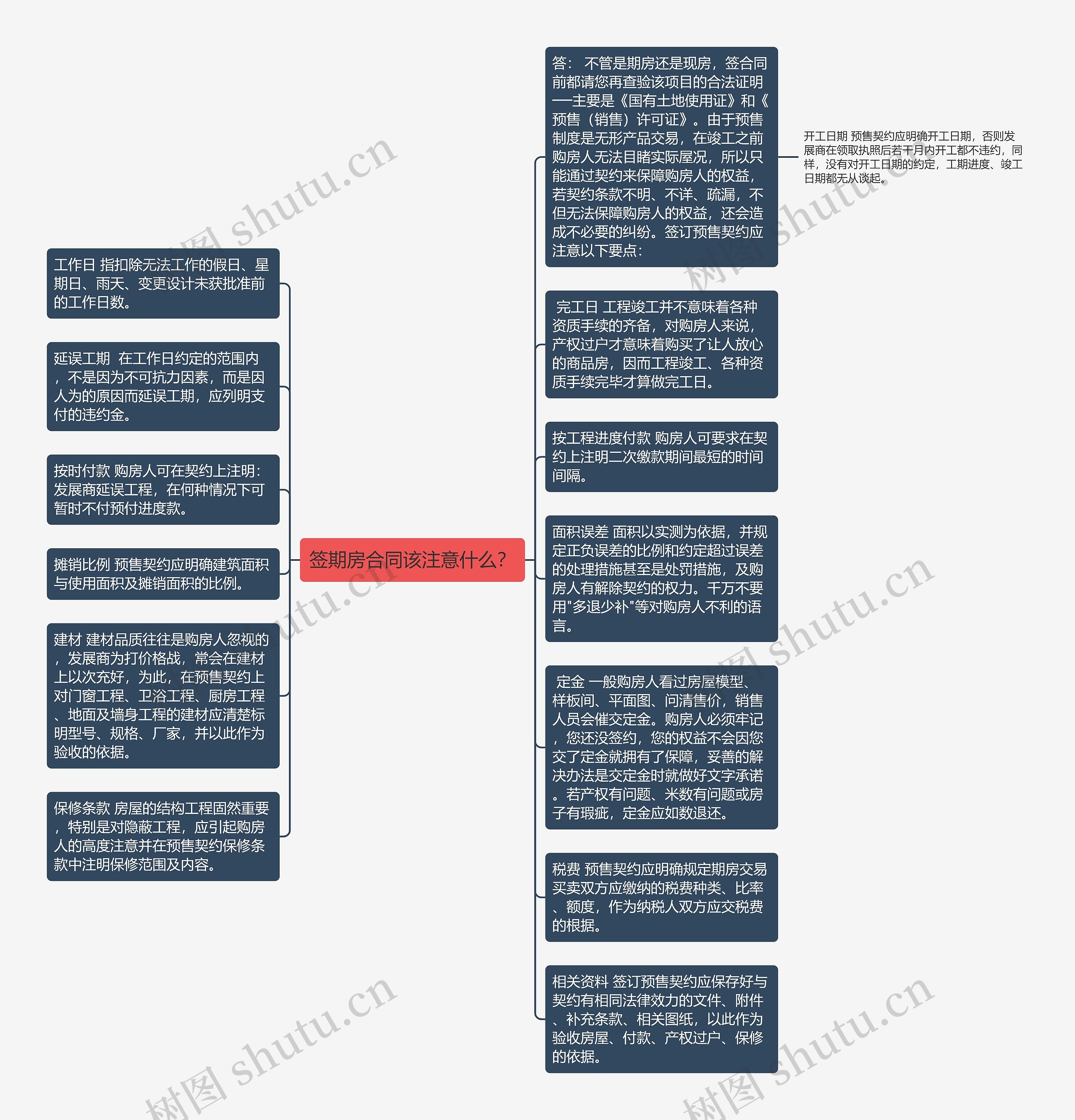 开工日期 预售契约应明确开工日期,否则发展商在领取执照后若干月内开工都不违约,同样,没有对开工日期的约定,工期进度、竣工日期都无从谈起。