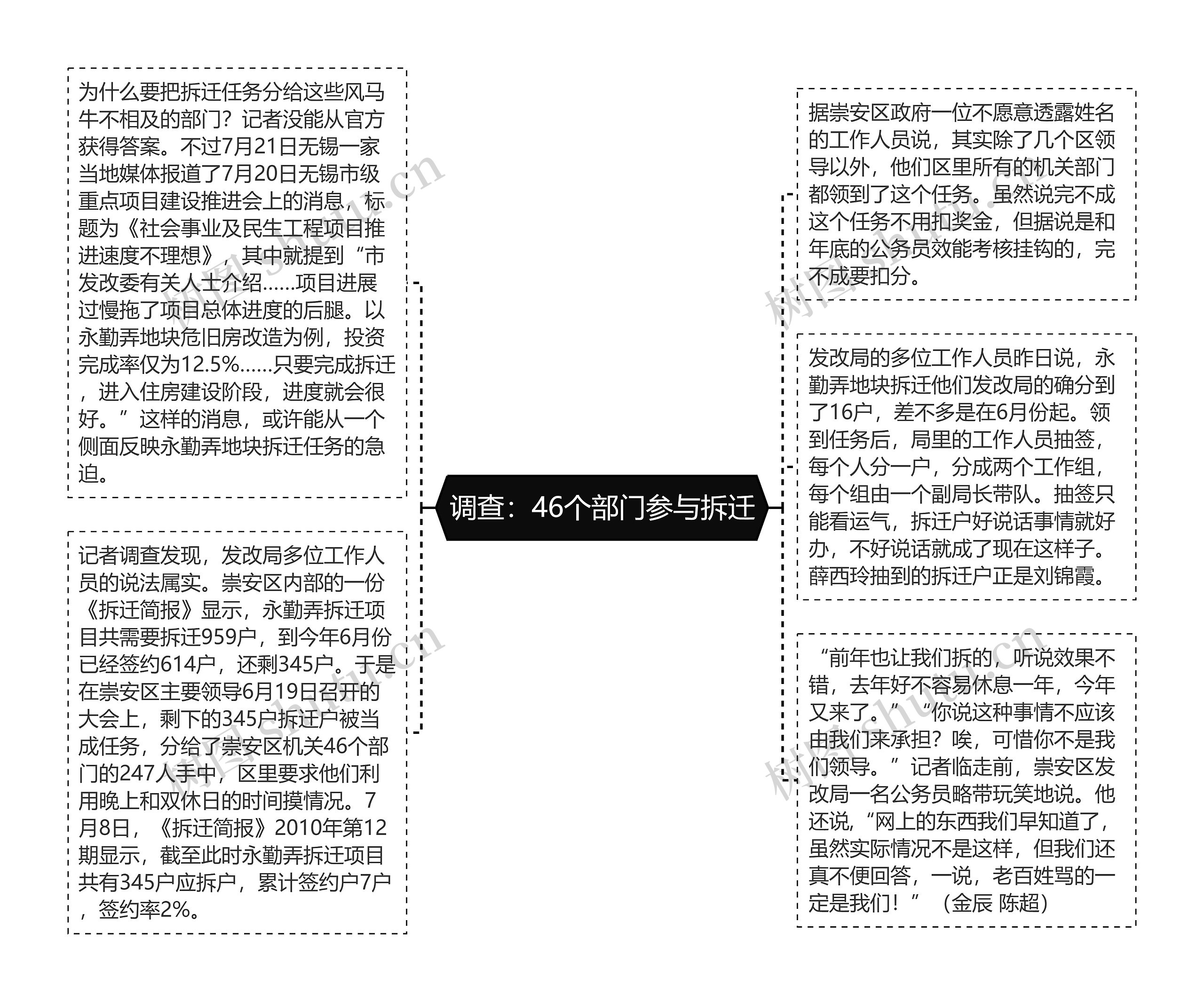 记者调查发现,发改局多位工作人员的说法属实。崇安区内部的一份《拆迁简报》显示,永勤弄拆迁项目共需要拆迁959户,到今年6月份已经签约614户,还剩345户。于是在崇安区主要领导6月19日召开的大会上,剩下的345户拆迁户被当成任务,分给了崇安区机关46个部门的247人手中,区里要求他们利用晚上和双休日的时间摸情况。7月8日,《拆迁简报》2010年第12期显示,截至此时永勤弄拆迁项目共有345户应拆户,累计签约户7户,签约率2%。