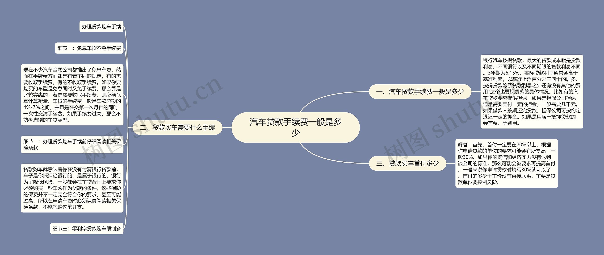 树图思维导图提供《汽车贷款手续费一般是多少》在线思维导图免费制作,点击“编辑”按钮,可对《汽车贷款手续费一般是多少》进行在线思维导图编辑,本思维导图属于思维导图模板主题,文件编号是:a42b1a3456f12932c2fdcb8540c44c16