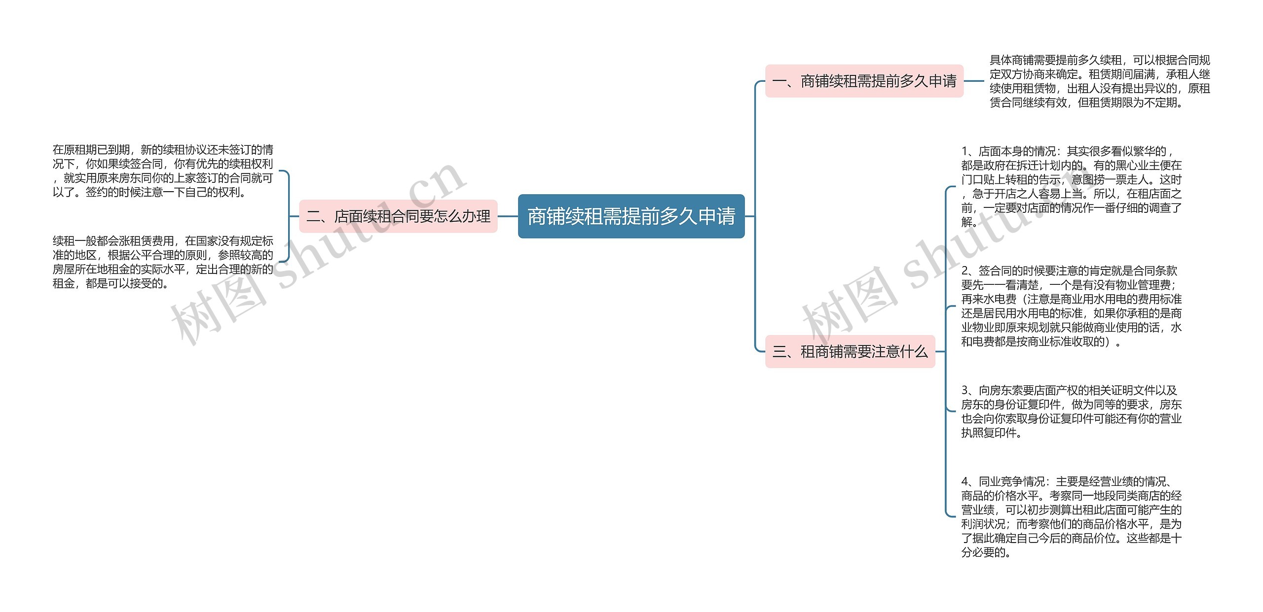 树图思维导图提供《商铺续租需提前多久申请》在线思维导图免费制作,点击“编辑”按钮,可对《商铺续租需提前多久申请》进行在线思维导图编辑,本思维导图属于思维导图模板主题,文件编号是:b89a22c0d26a955171293c2ff133dba8